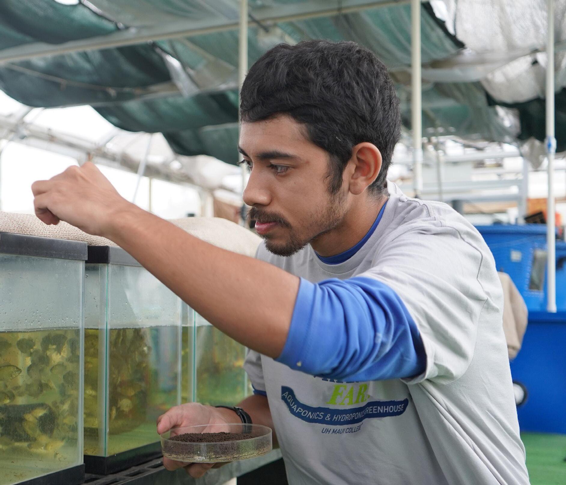 Pictured: Remy Romo-Valdez tends to young tilapia in the campus aquaponics lab.