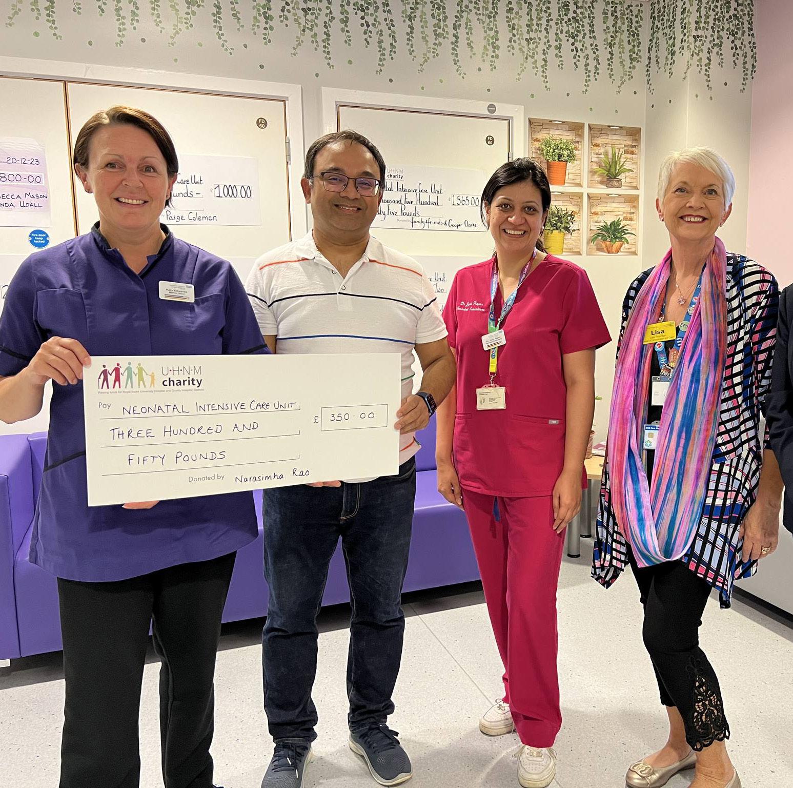 UHNM consultant Dr Narasimha Rao donated his leaving collection to UHNM Charity for the benefit of future patients. The consultant neonatologist left UHNM after five and a half years on the Royal Stoke’s Neonatal Intensive Care Unit (NICU) and donated the £350 gifted to him by his friends and colleagues at his leaving dinner to UHNM Charity.