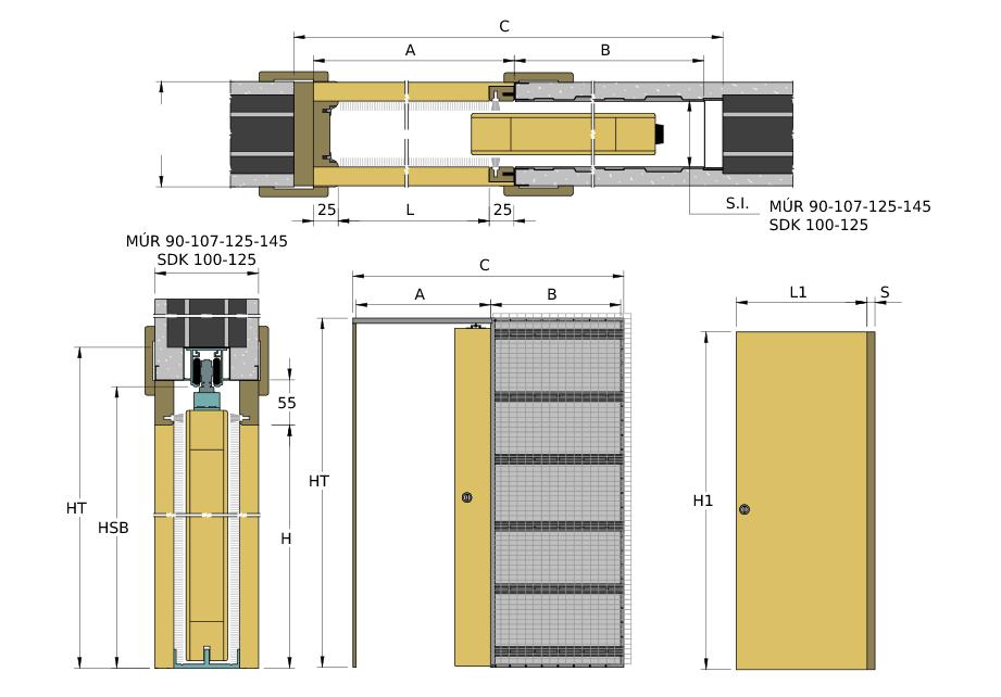 Stavebný otvor pre puzdrá do muriva je potrebné vytvoriť o 4 cm širší a 2 cm vyšší. Maximálna hrúbka dverového krídla 40/64mm. Atypické rozmery H = 1000 ÷ 2700mm