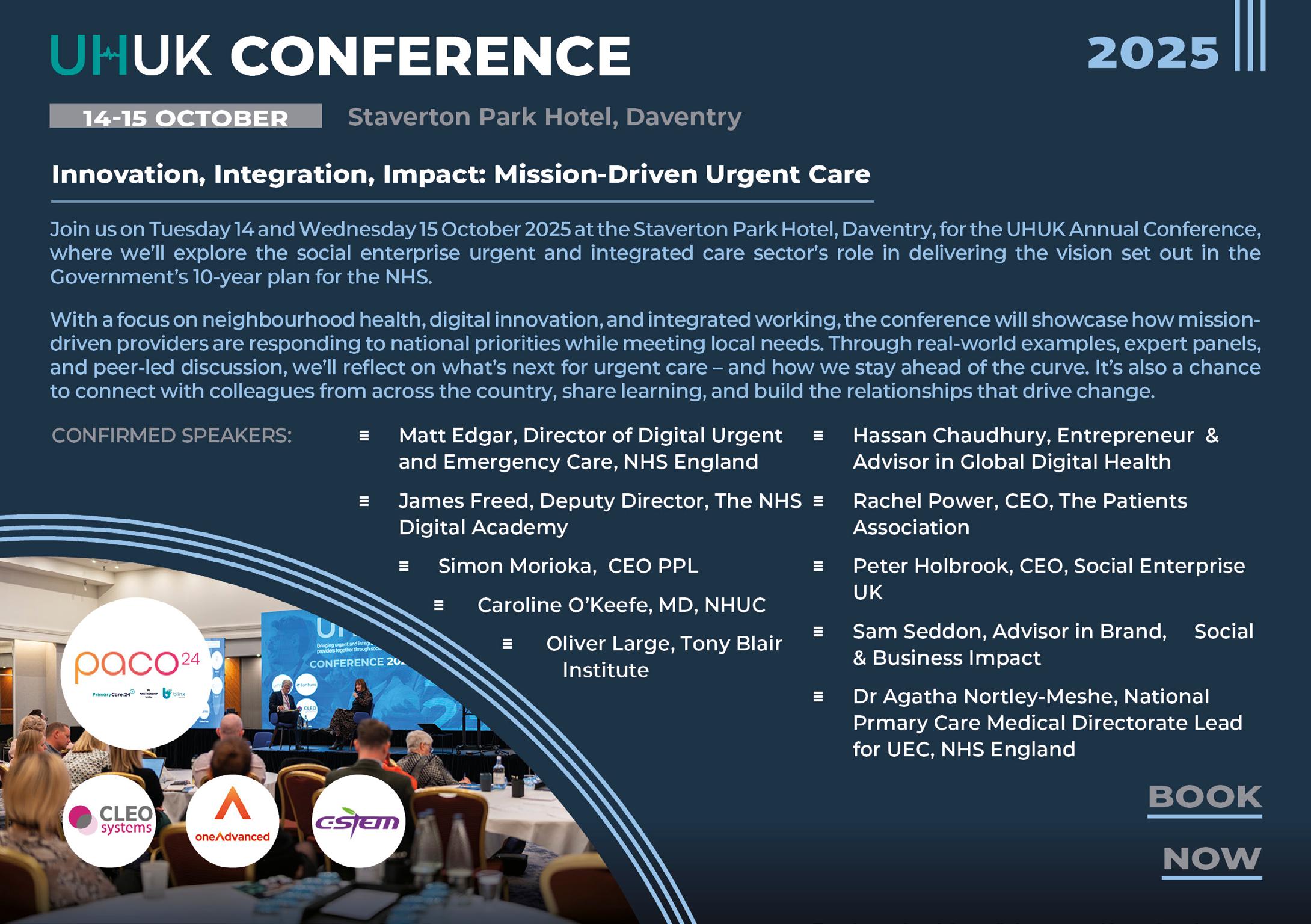 Planning for the annual conference this October is well underway. This year’s theme is Innovation, Integration, Impact: mission-driven urgent care. We’ll explore how UHUK members are shaping the future of urgent care by combining digital innovation, place-based working, and people-first approaches. Expect powerful contributions from NHS England, system leaders, and front-line innovators - plus plenty of space to share what works, network with peers, and celebrate collective impact. If you only attend one event this year, make it this one.