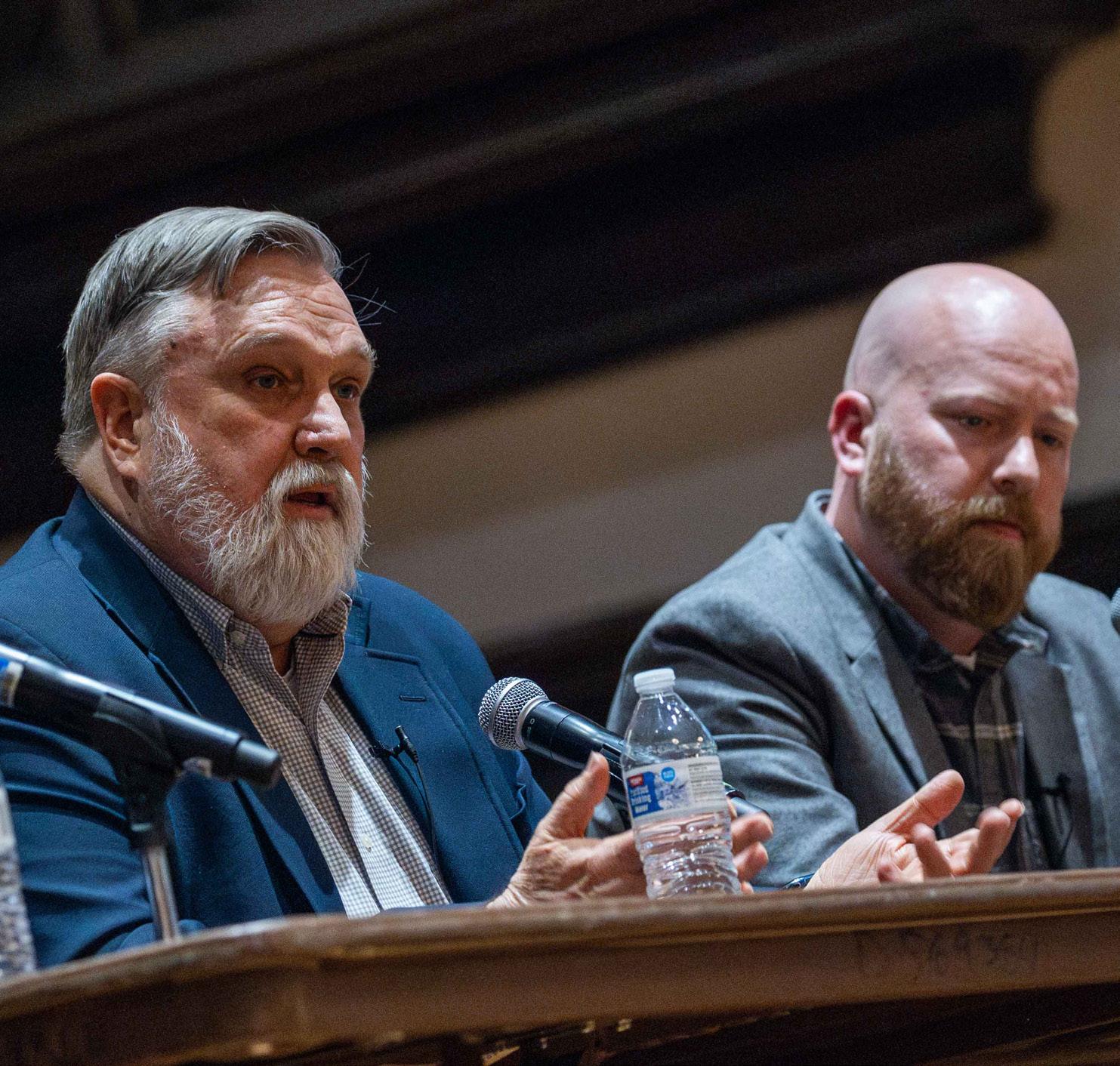 Douglas Wilson, pastor of Christ Church, Toby Sumpter, pastor at King’s Cross and Benjamin Merkle, president of New Saint Andrews College, held the stage at the Administration Auditorium on April 11, hosting the event themed “Honest Questions, Honest Answers.”