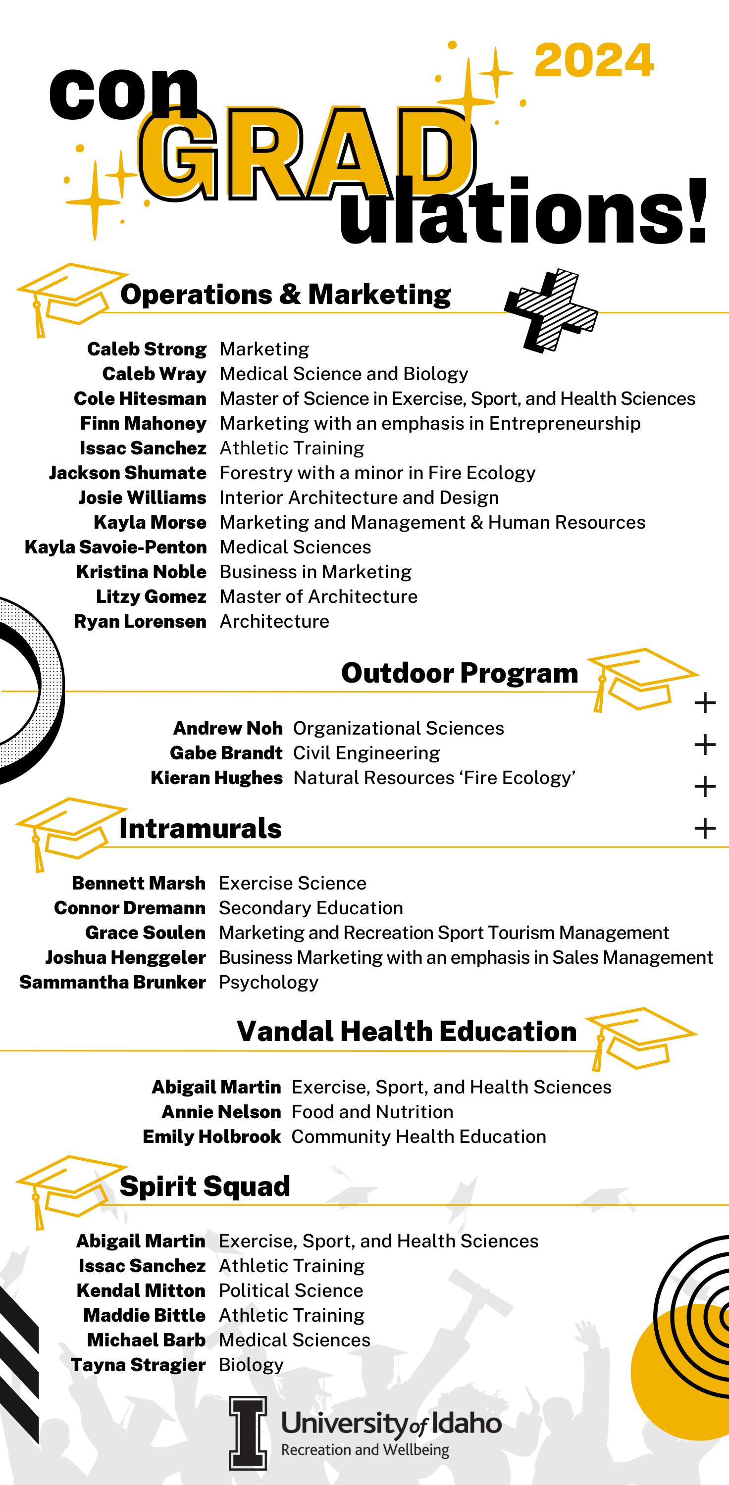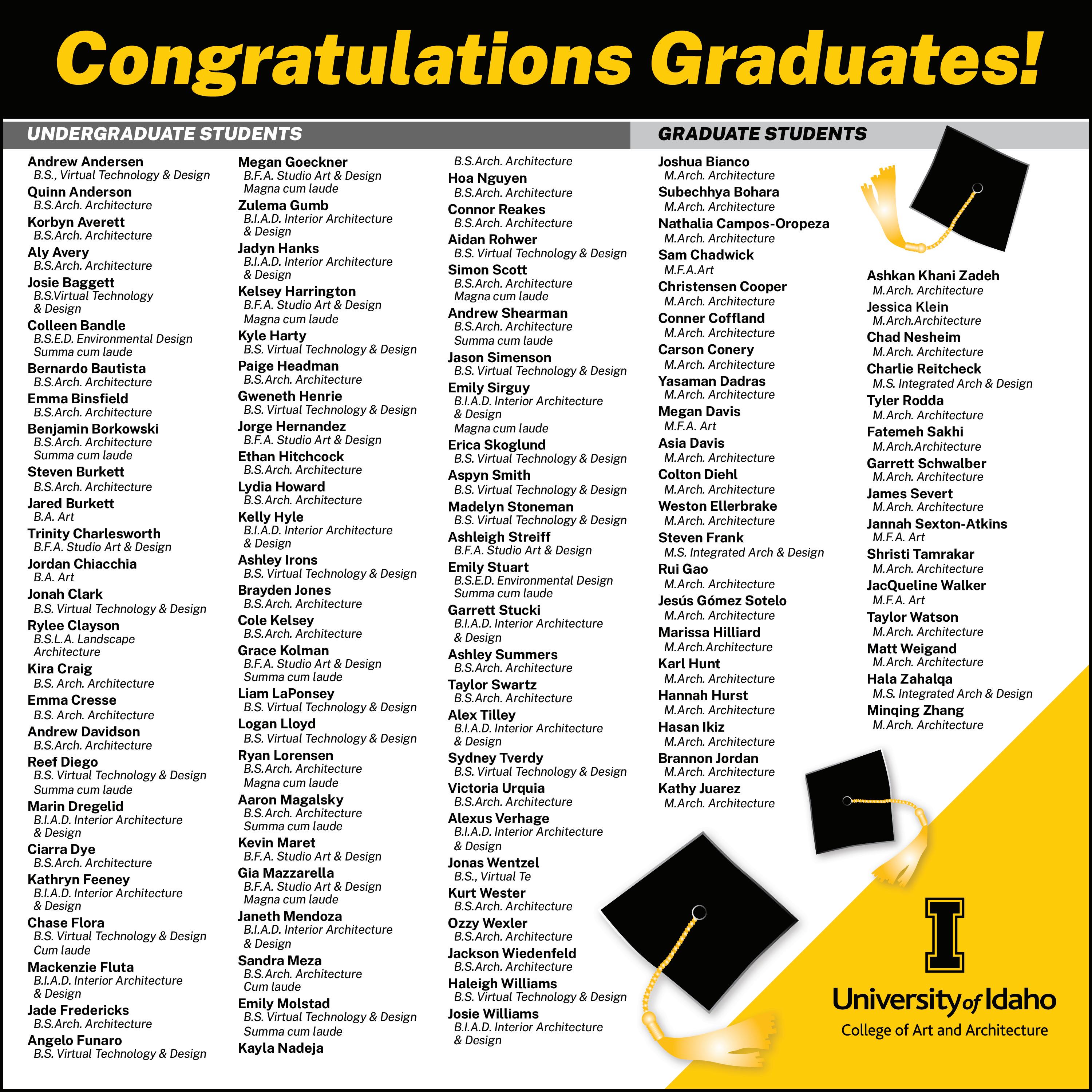 Commencement for graduates in Moscow is May 11 with each college graduating at different times. College of Art and Architecture, Education, Health and Human Science, Law and Letters, Arts and Social Sciences is set to graduate at 9:30 a.m. in the P1FCU Kibbie Dome.
