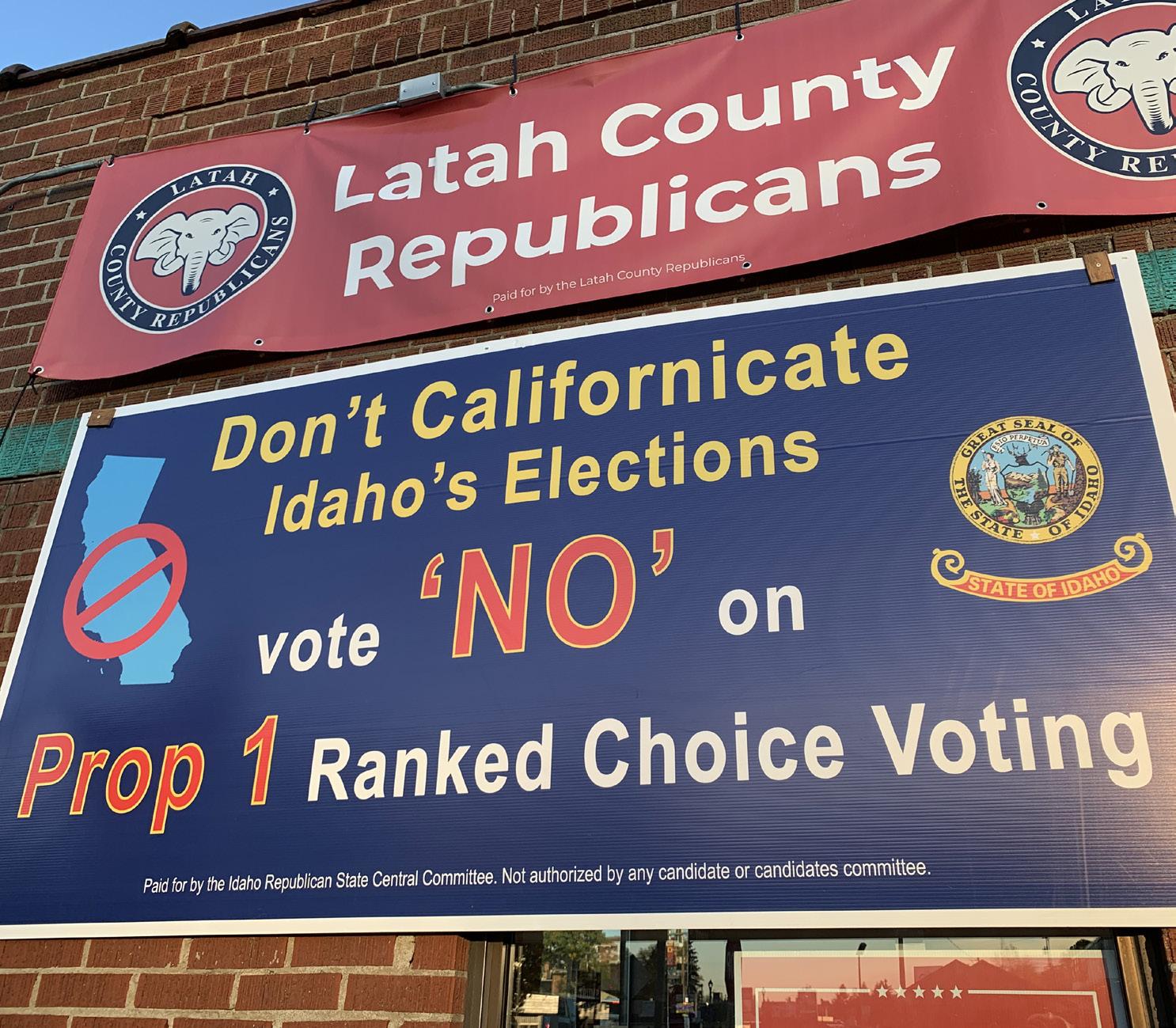 “Vote No on Prop 1” sign outside of the Latah County Republicans Headquarters in Moscow