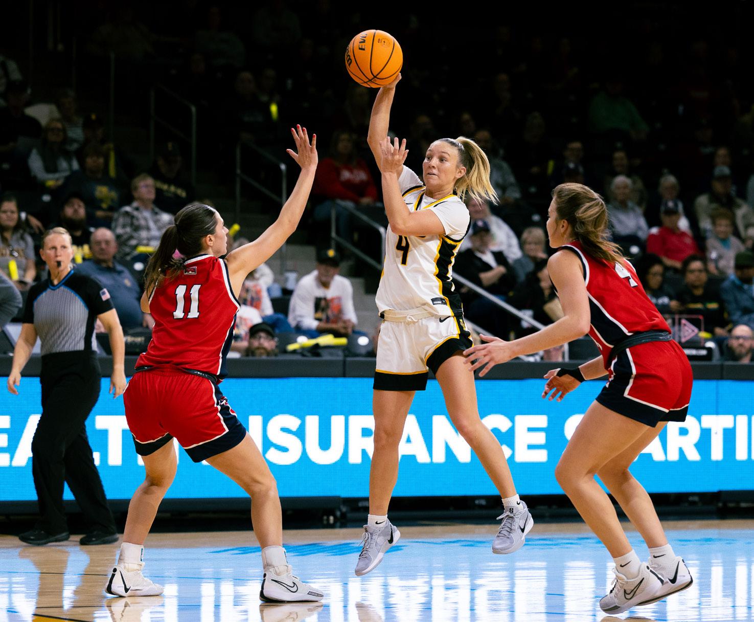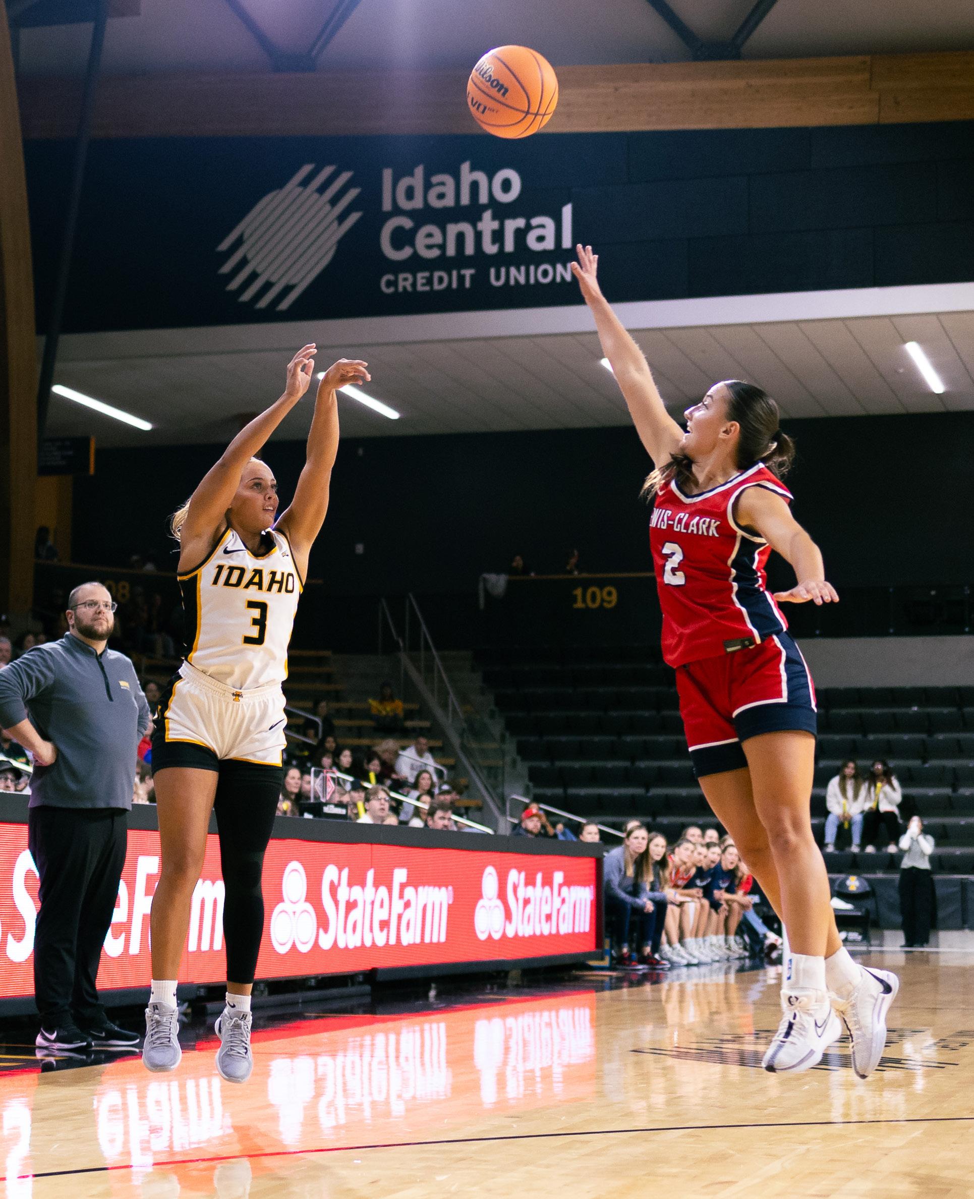 Idaho guard Ashlyn Wallace shoots a 3-pointer over Lewis-Clark’s Camden Barger