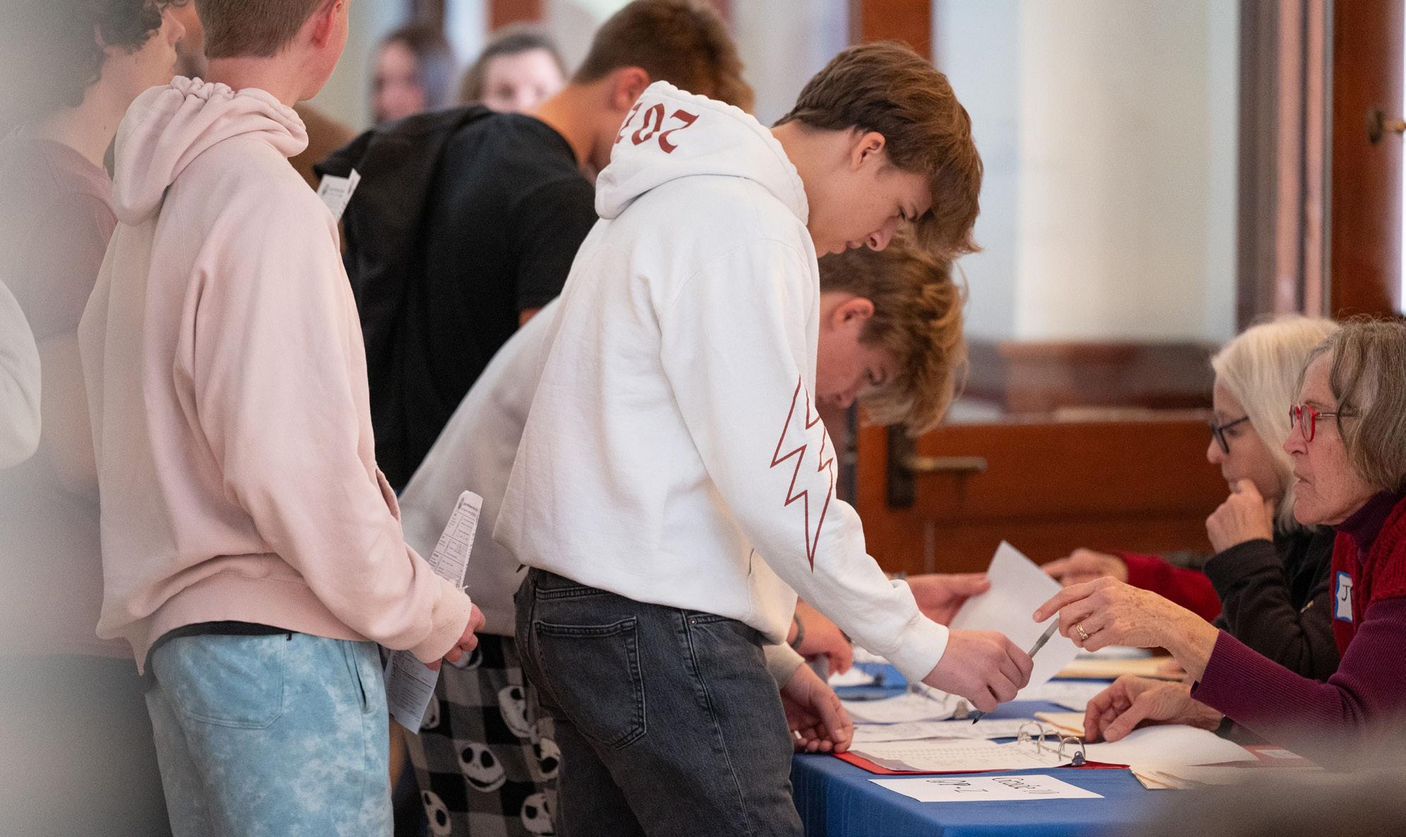 Makeshift voting booths lined a large room in the 1912 Center last week for the Moscow League of Women Voters’ mock election. Around 850 high school social studies students from the Moscow area gathered throughout the day to cast their ballots in the mock election. This mock election happens every two years and has been a tradition of the League of Women Voters for the last 30 years.