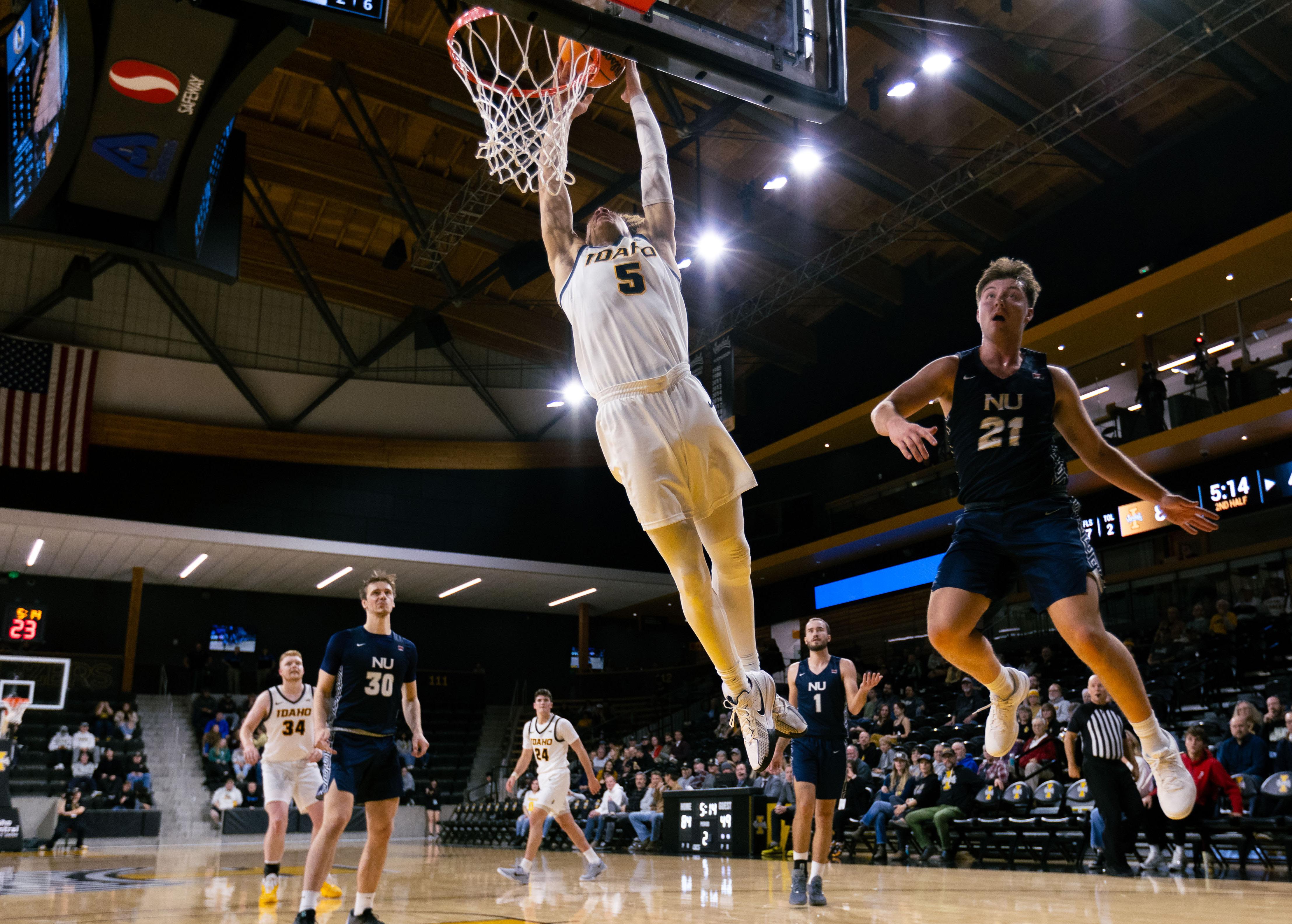 John Keegan | Argonaut Idaho guard Isaiah Brickner about to slam a dunk down over Northwest’s Ethan Martin