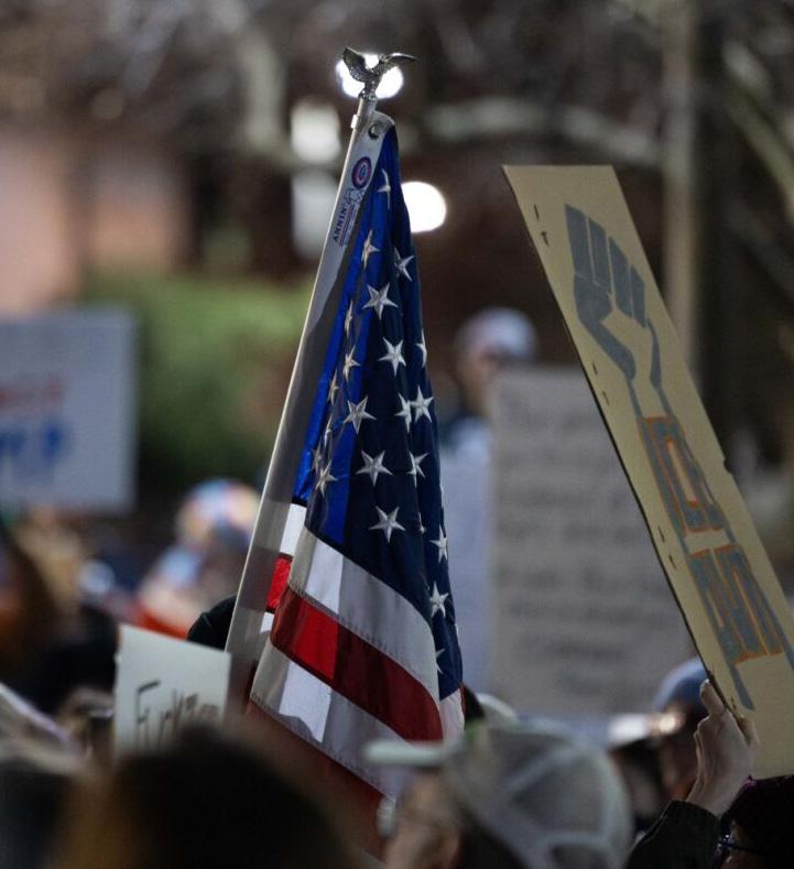 An American flag amidst protestors and signs on campus against ICE