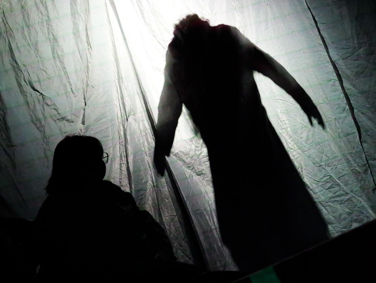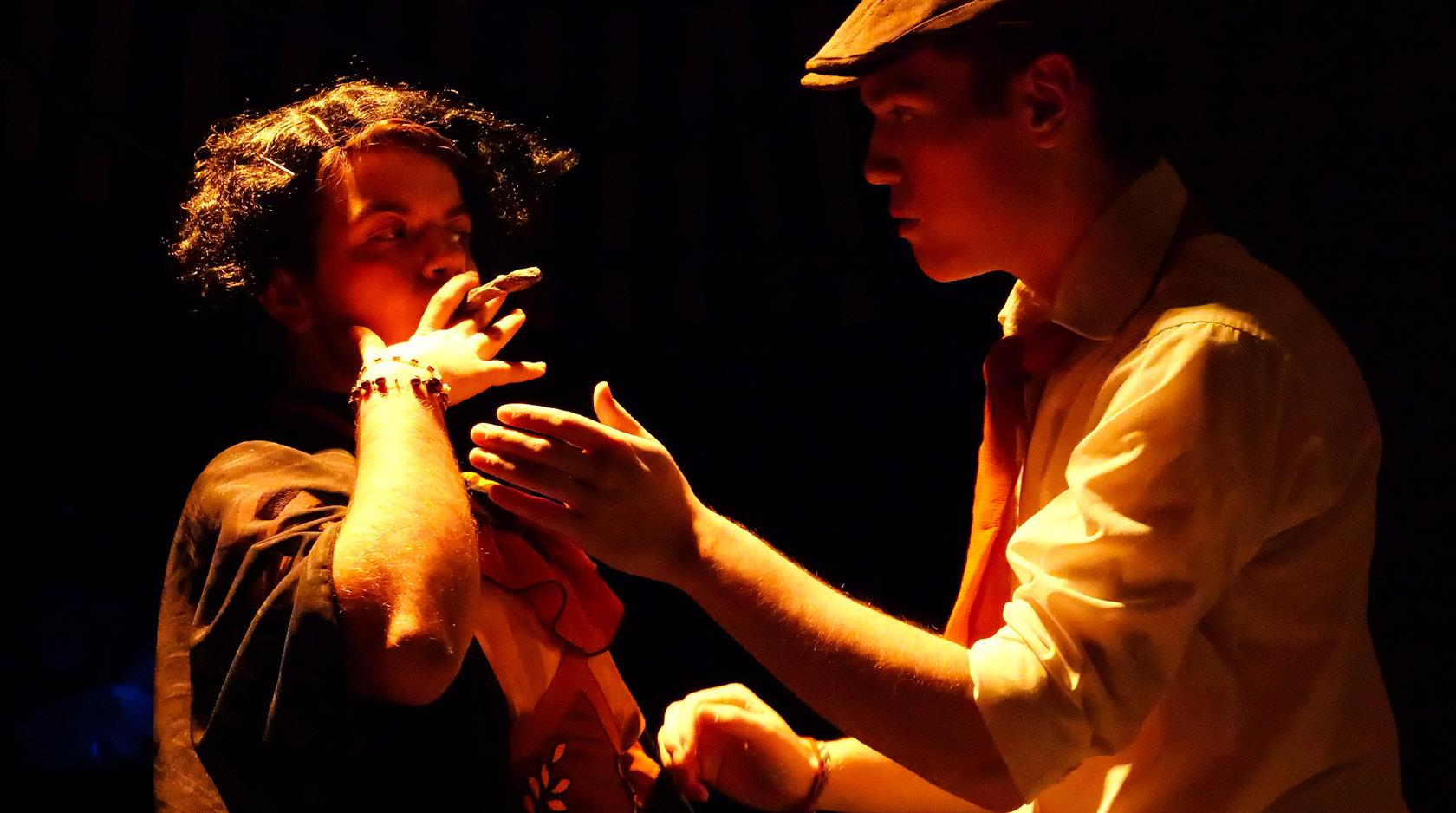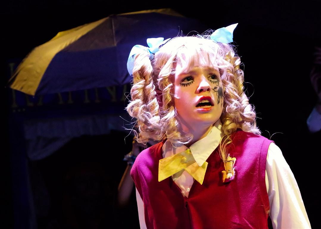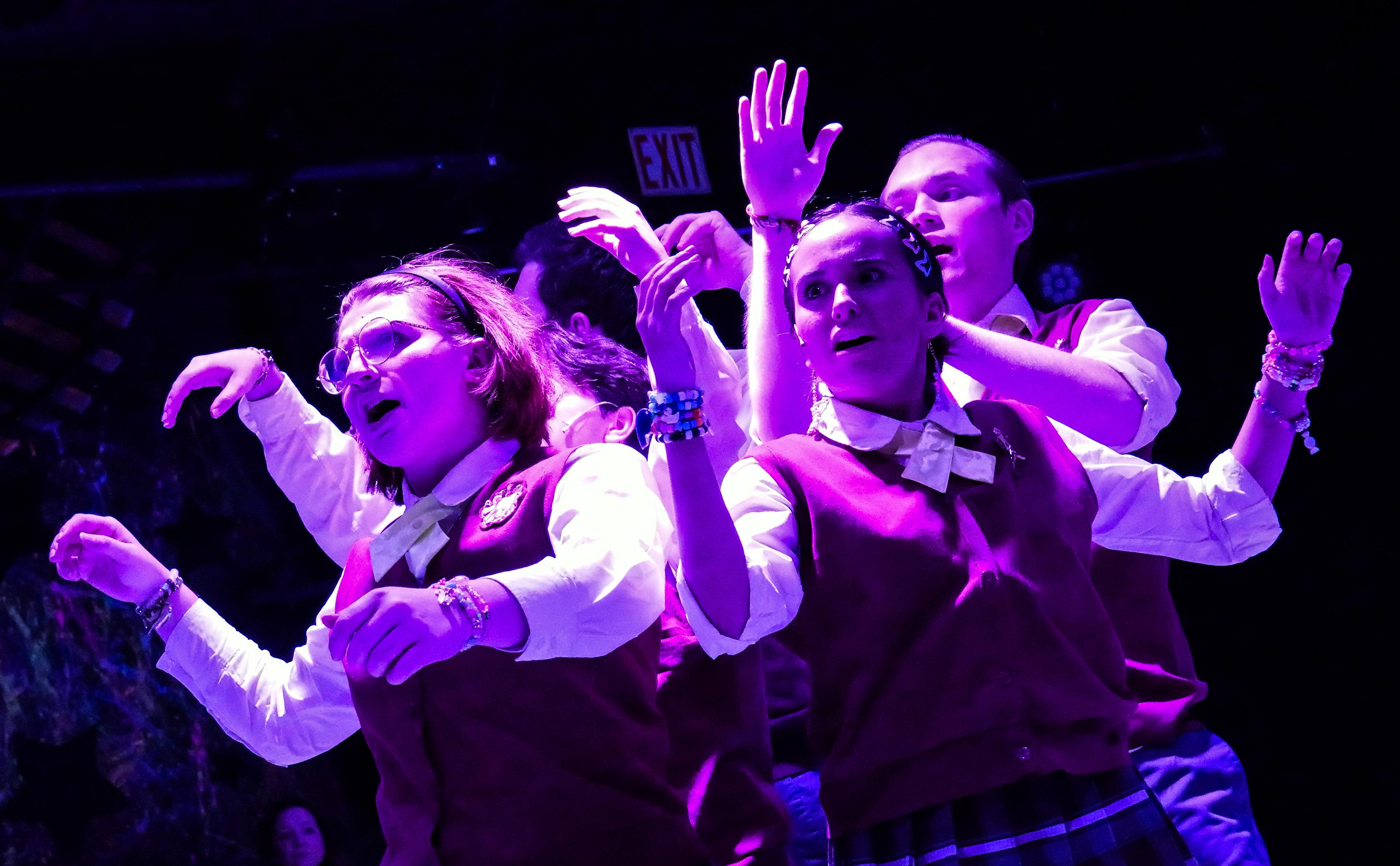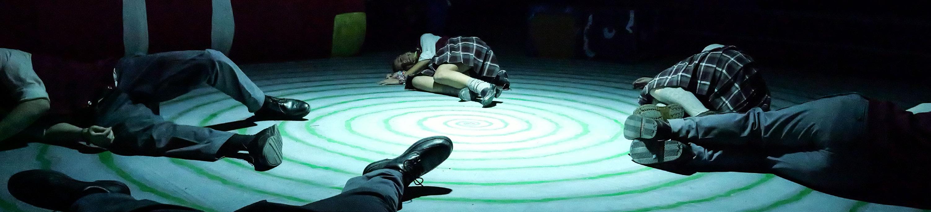 The Saint Cassian chamber choir lie on the ground after the opening scene of the musical “Ride the Cyclone.”
