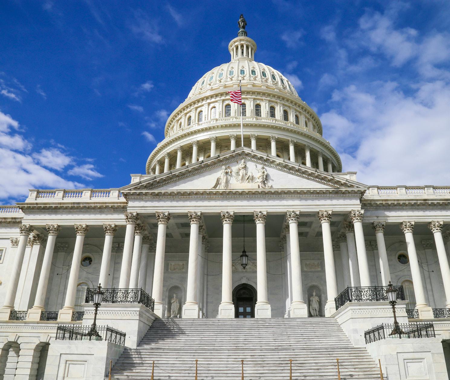 The United States Capitol building, in Washington D.C. against a blue sky and clouds