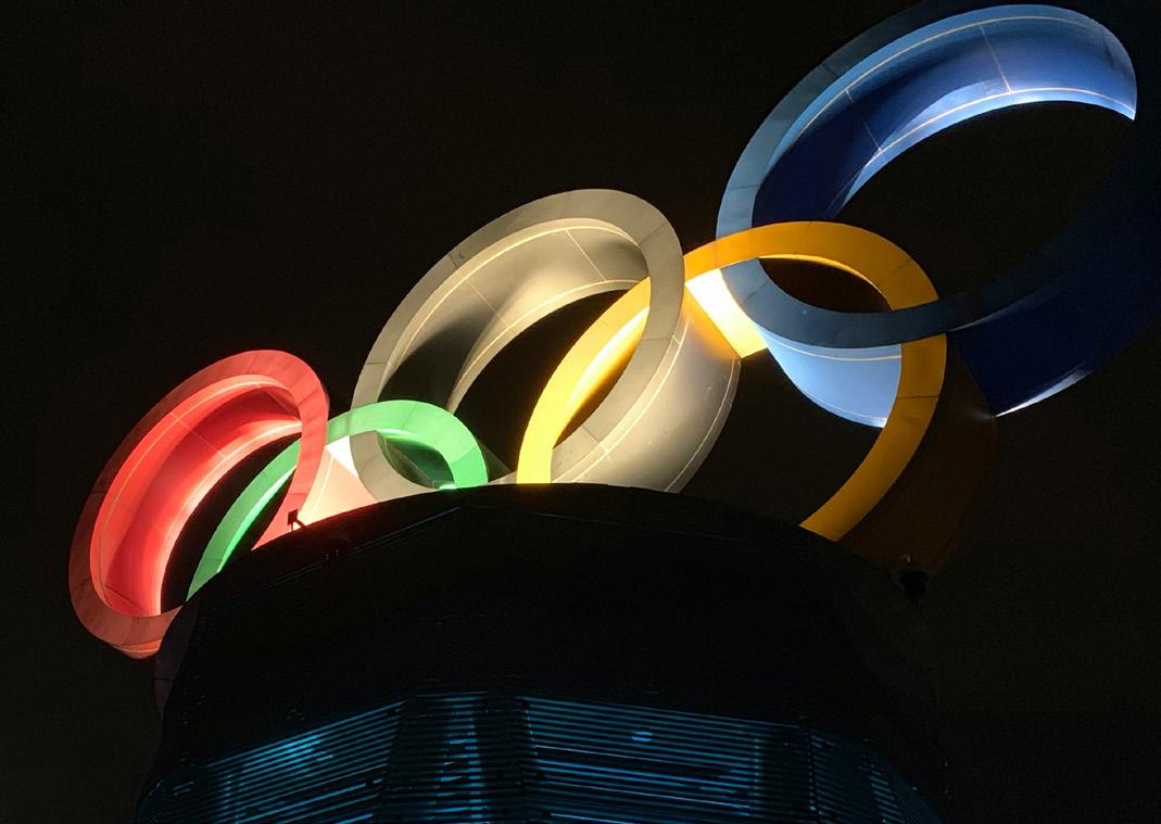 The Olympic rings against a night sky, on top of a building