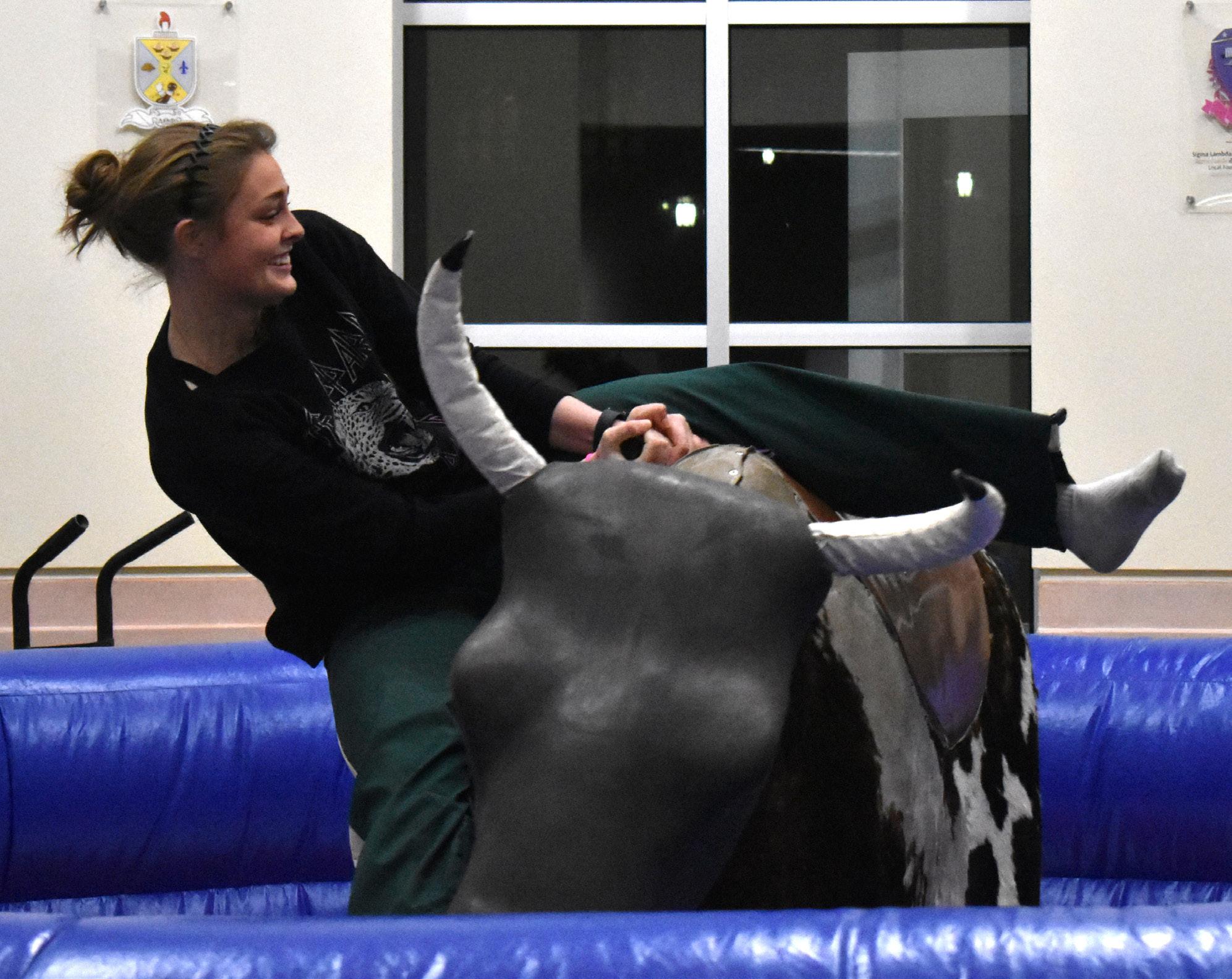 University of Idaho student Molly Haeberle rides the mechanical bull at the ASUI Winter Social on Wednesday, Feb. 25