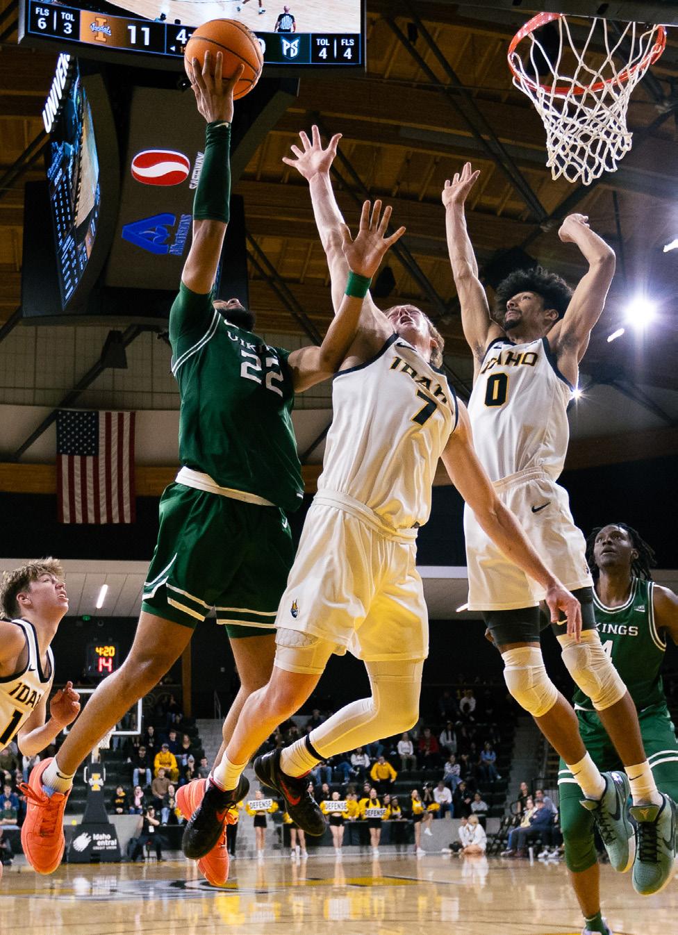 John Keegan | Argonaut PSU forward Isaiah Johnson goes up for a layup over two UI players