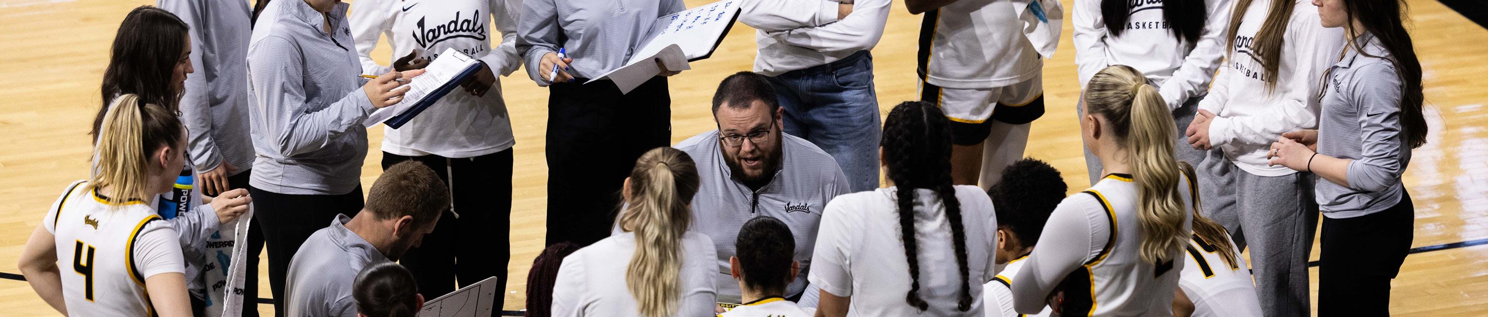 Head coach Arthur Moreira breaks down plays for the Vandals women’s basketball team during a timeout