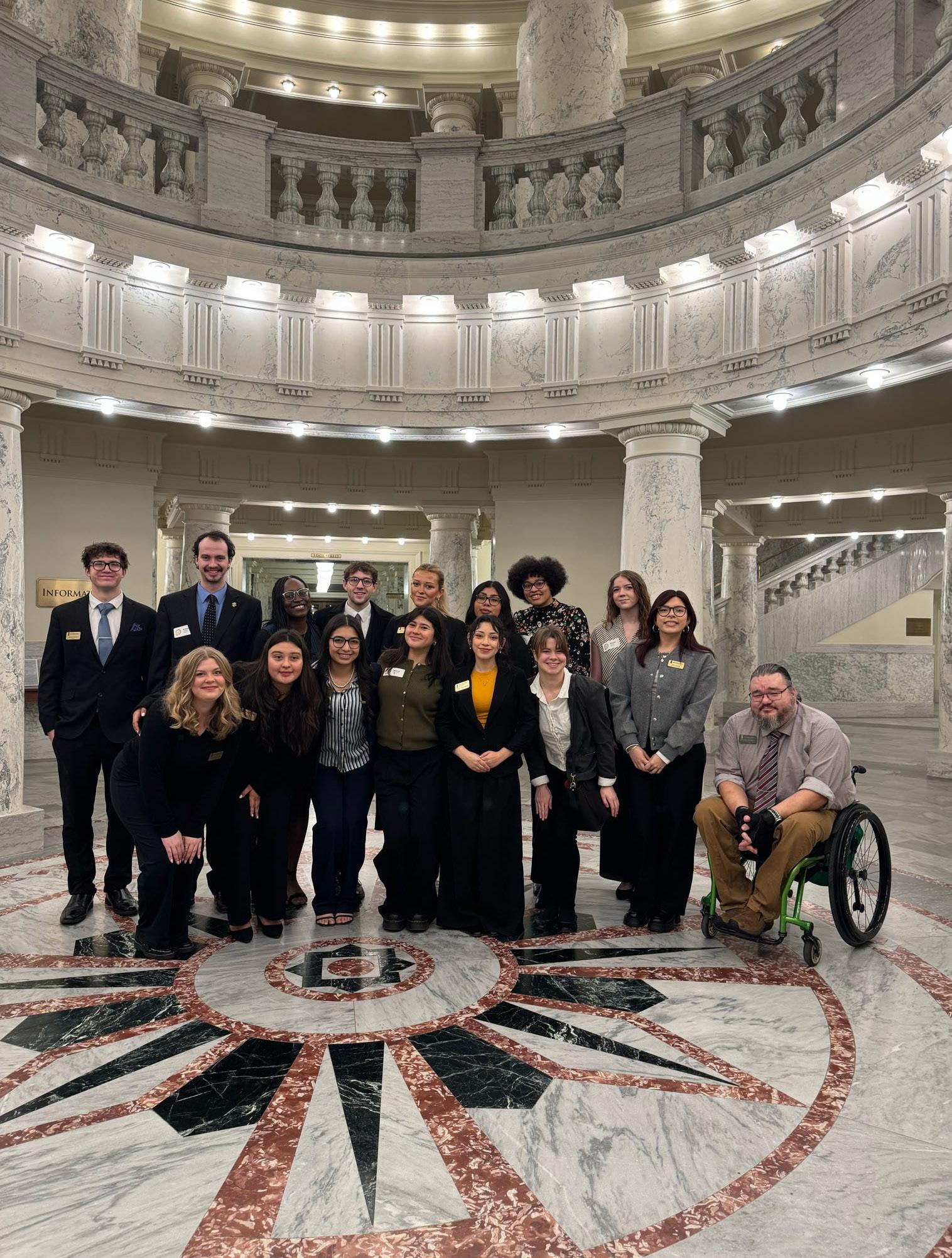 The group of students and ASUI members traveled to Boise for the 2026 ASUI Legislative Ambassador trip, an annual opportunity for students to learn about the state’s legislative process firsthand and promote UI interests.