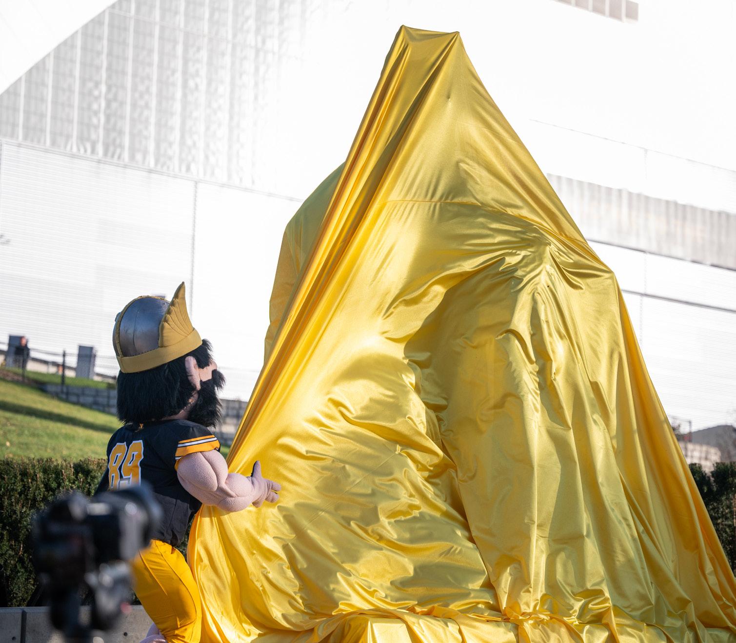 Colton Moore | Argonaut Mascot Joe Vandal pulls the gold sheet off of the statue