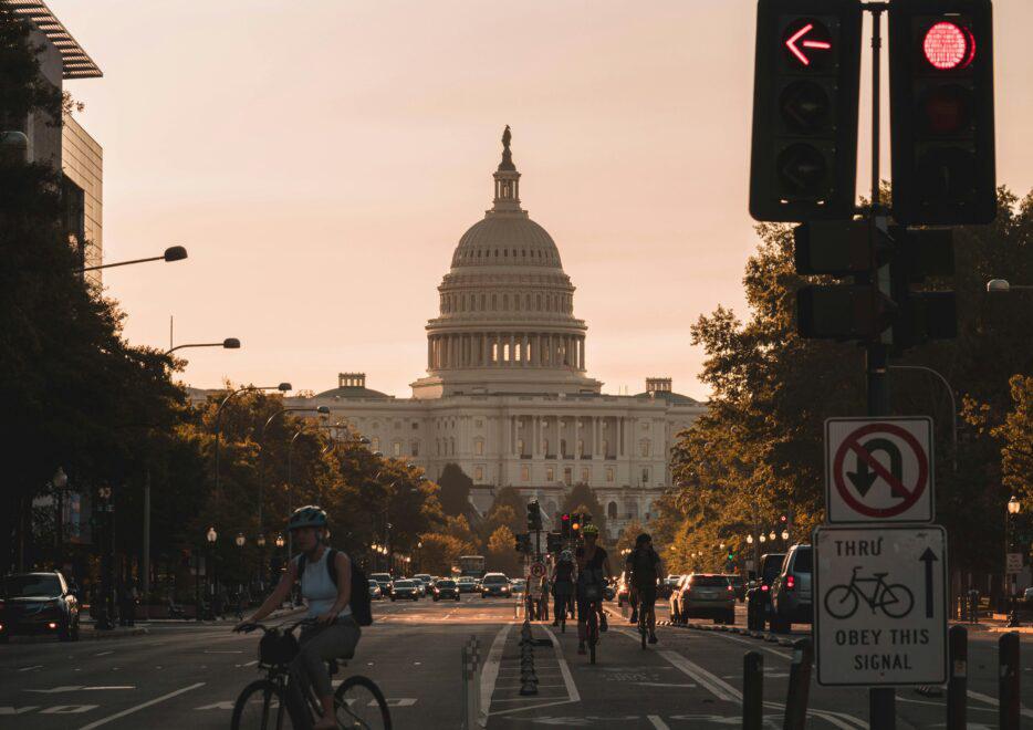 People in the streets near the United States Capitol in Washington, D.C. during a cloudy and hazy day