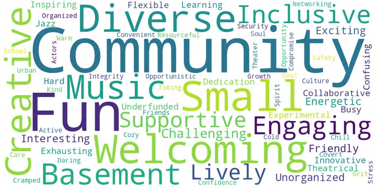 When students were asked to share words they associate with the School of Theatre and Music, their responses were collected and visualized. The size of each word reflects how frequently it was mentioned.