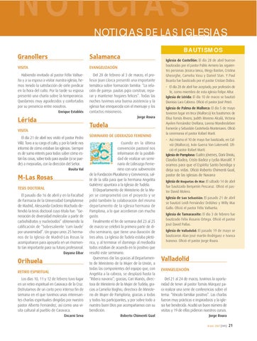 Iglesia de Castellón: El día 28 de abril bueron bautizadas por el pastor Pablo Armero las siguientes personas: Jessica Iancu, Megy Baston, Cristina Gheorghe, Camelia Vasu y Daniel Stan. Y Paul Boanta fue bautizado por el pastor Cristian Dobra. • El día 28 de abril fue aceptado, por profesión de fe, como miembro de esta iglesia Felipe Altur. Iglesia de Lérida: El día 10 de marzo se bautizó Dionisio Lara Cabrera. Ofició el pastor José Peiró. Iglesia de Palma de Mallorca: El día 5 de mayo tuvieron lugar en Inca (Mallorca) los bautismos de Elisa Tomás Rivero, Judith Moreno Alcalá, Victoria Ayelen Fernández Orellana, Lorena Wandresleben Fornerón y Sebastián Casteñeda Montenares. Ofició la ceremonia el pastor Rafael Martí. • Así mismo el 10 de mayo fue bautizado, en Calviá (Mallorca), Iván Guerra Van Lakerveld. Ofició el pastor Rafael Martí. Iglesia de Pamplona: Cuatro jóvenes, Dani Onoiu,