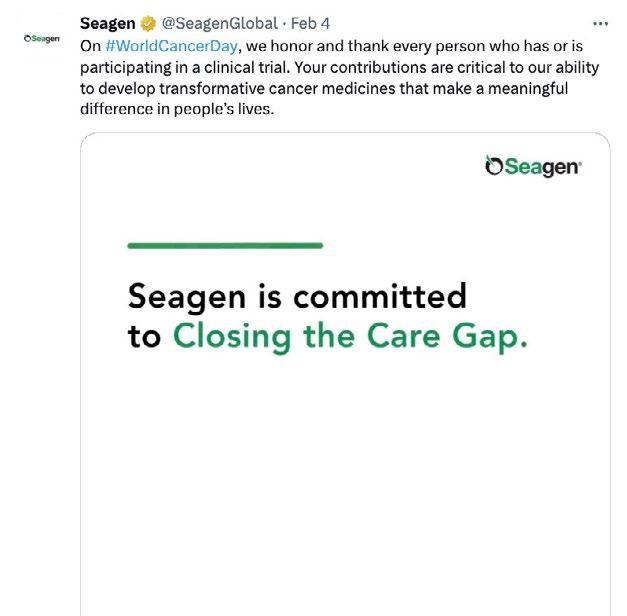 Seagen honoured and thanked every person with cancer participating in a clinical trial on World Cancer Day, stressing the fact that their contributions are critical to Seagen’s ability to develop transformative cancer medicines that make a meaningful difference in people’s lives. They also organised a town hall with their international workforce. The event included an interview with Cary Adams, CEO of UICC, who talked about the importance of World Cancer Day and the need to close the care gap.