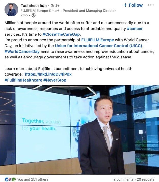 As part of the awareness campaign, Fujifilm Europe worked with multiple newspapers and editors to promote their partnership with World Cancer Day and their campaign ‘We Will Never Stop Innovating For A Healthier World’ underscoring their commitment to creating innovative technologies and solutions that contribute to a world with improved health outcomes. This powerful statement demonstrates Fujifilm’s dedication to making a positive impact on people’s lives. The company also posted various messages in support of World Cancer Day across its channels.