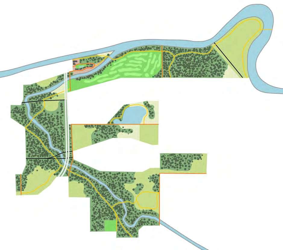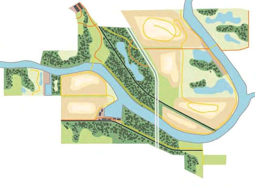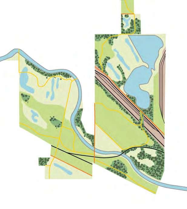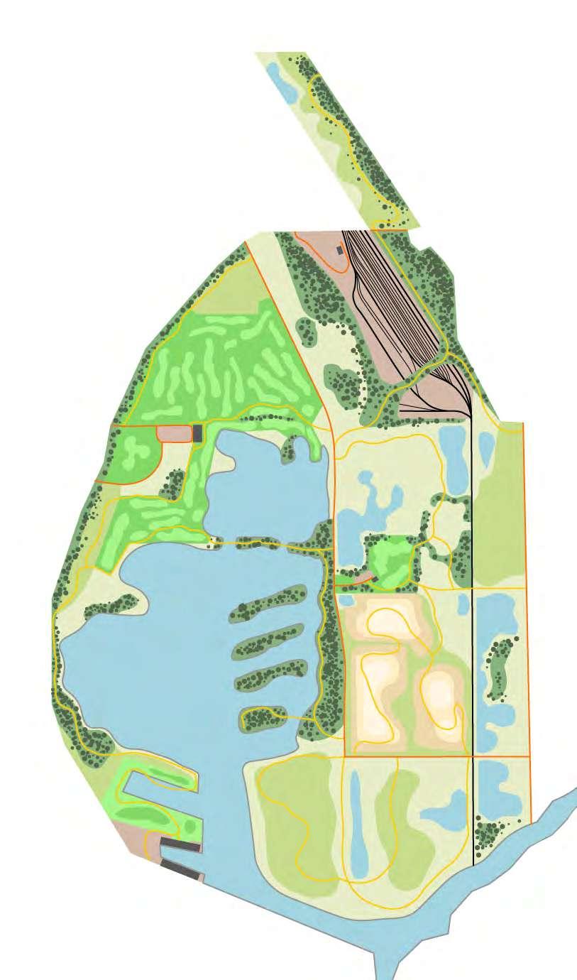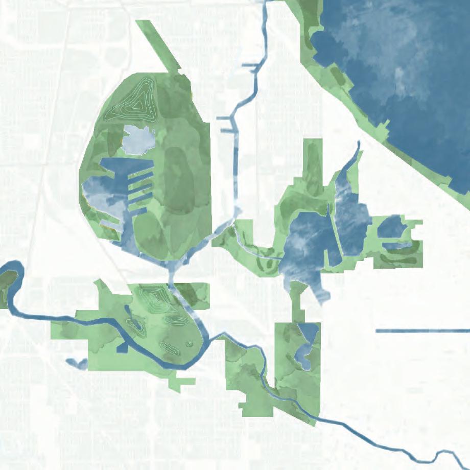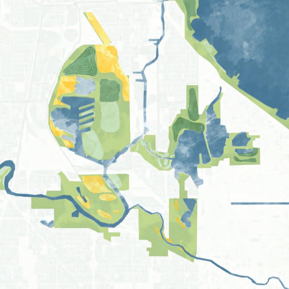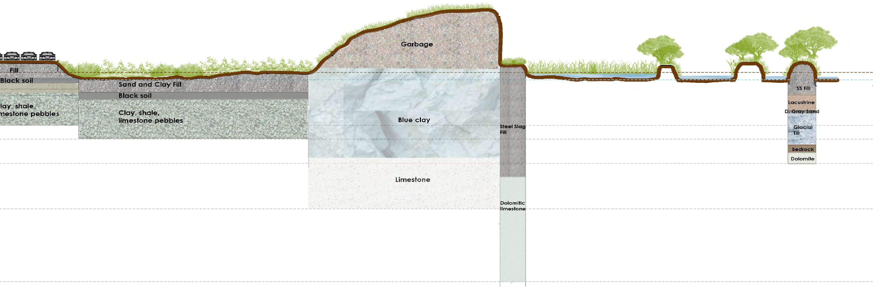 Proposed native woodlands use deep-rooted species to clean soil through phytoremediation, control erosion, purify runoff, and remediated landscape.