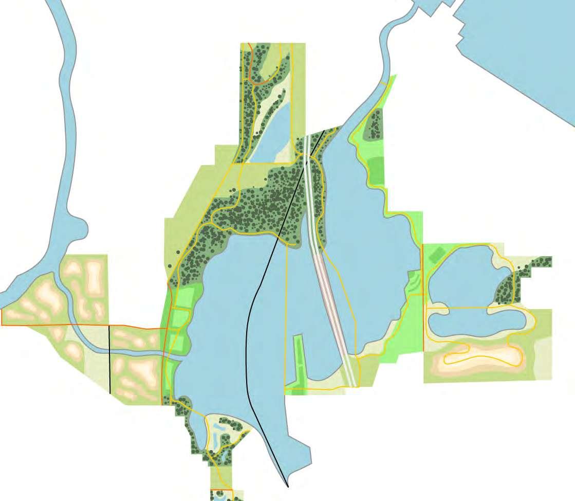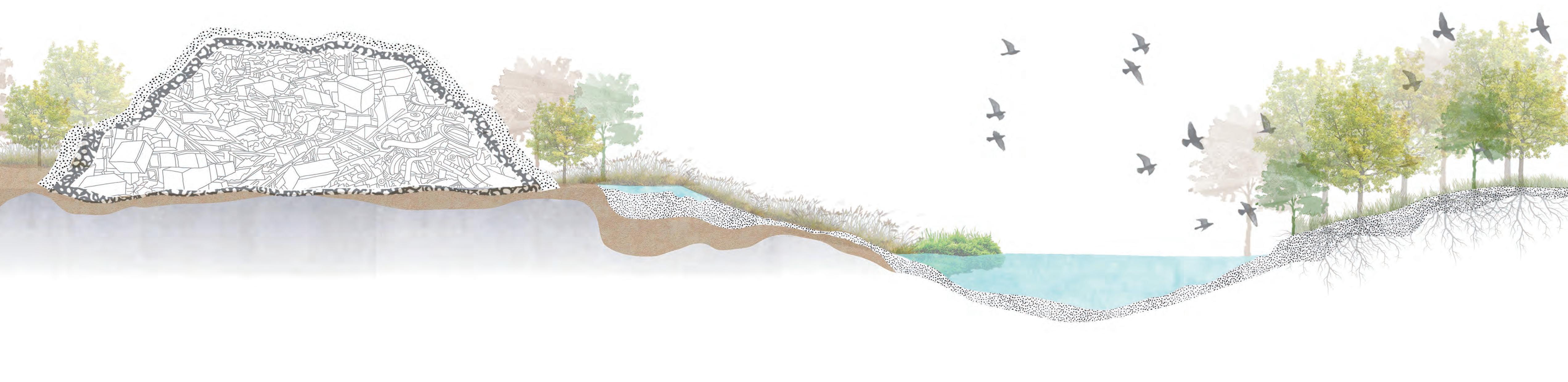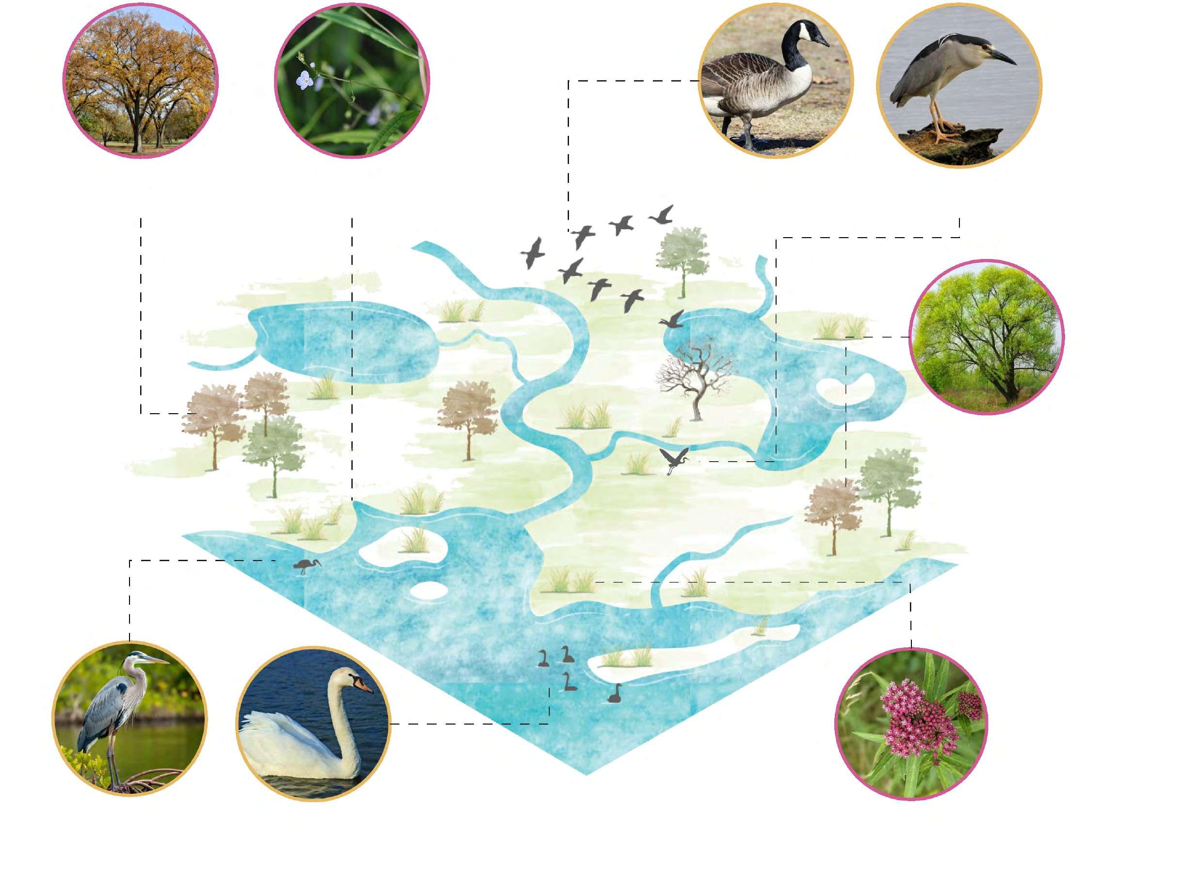 These sections show the restoration of a hemimarsh through invasive species removal, native planting, and hydrologic controls, creating diverse habitats of open water and emergent vegetation for native wildlife. Alongside this, bioremediation of a former landfill improves soil and water quality while capturing methane for energy to heat homes. Together, these projects improve ecosystem health, creating productive soils, clean water, and diverse habitats that support native wildlife.
