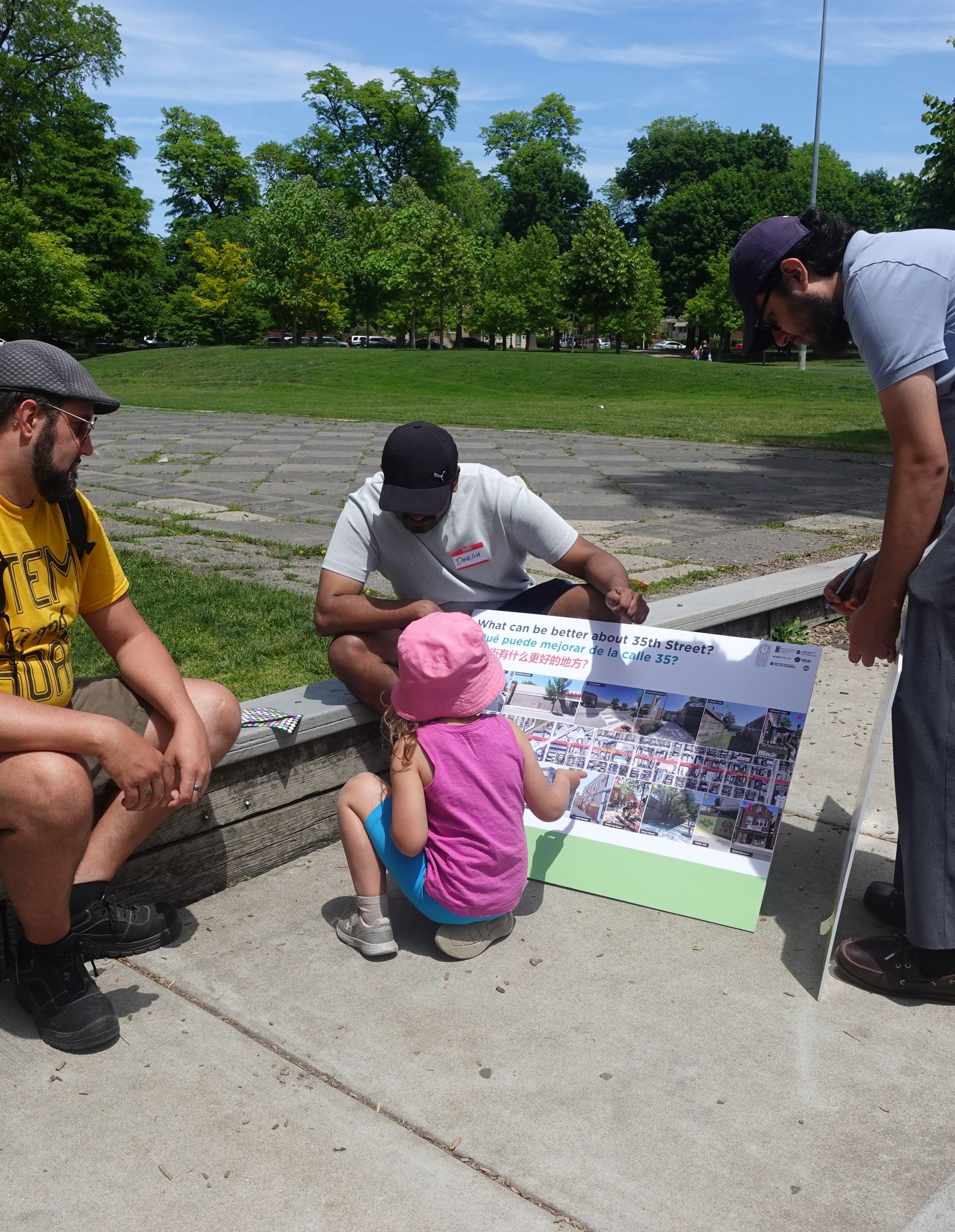 After conducting preliminary research, the UIC team conceived a plan comprising intentional engagement activities designed to understand residents’ experiences and interests around 35th Street. The activities centered upon the plan principles described earlier of inclusivity, increased mobility for pedestrians and bikers, enhanced community interaction and engagement, and local enterprise promotion. Invaluable insights shared by community members in the engagement phase would then help guide the codesign process.