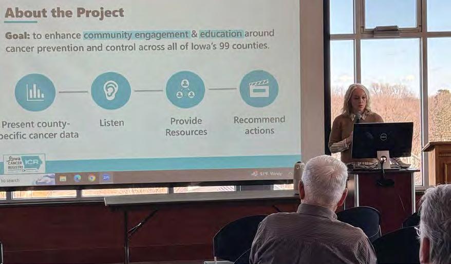As of October 2025, the team has visited with residents in 38 of Iowa’s counties. Charlton says she and her team start the conversation with what she calls “level setting”—defining key terms, explaining the role of the Iowa Cancer Registry, and emphasizing that no one thing causes cancer. Then they walk through the data: the county’s most diagnosed new cancers and their risk factors, how those numbers compare to