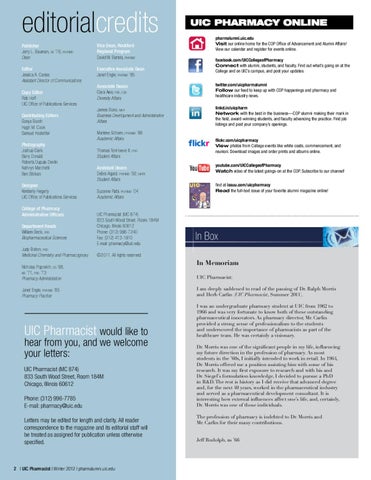 UIC Pharmacist (MC 874) 833 South Wood Street, Room 184M Chicago, Illinois 60612 Phone: (312) 996-7785 E-mail: pharmacy@uic.edu Letters may be edited for length and clarity. All reader correspondence to the magazine and its editorial staff will be treated as assigned for publication unless otherwise specified.
