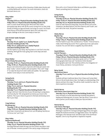Mary Heller is a member of the University of Idaho dance faculty and a certified BeMoved® instructor. For more information, check out: bemoved-dance.com Mary Heller Steppin’! Thursday 9:30 a.m. Physical Education Building (Studio 212) Friday 9:30 a.m. Physical Education Building (Studio 212) Learn a current street dancing style. We’ll start with a basic syncopated step dance with all the sound coming from our feet, body sounds of hitting our legs and hands, and using our voices. You’ll learn some history of this African American dance form and step out a simple challenge at the end. Come ready to have fun! Julie Strobel/ Sadie Champlin Hip-Hop Thursday 10 a.m. (Julie) 1 p.m. (Sadie) Physical Education Building (Studio 110) Friday 10 a.m. (Julie) and 1 p.m. (Sadie) Physical Education Building (Studio 110) Get the rhythm in your body. Hip-hop dance is cool! Don’t miss this workshop. We’ll get the music going, learn some steps and start dancing. Diane Walker Move It! Body Percussion Plus Thursday 10:30 a.m. Physical Education Building (Studio 212) Friday 10:30 a.m. Physical Education Building (Studio 212) Be your own instrument as you improvise with body percussion and body “scales,” uneven rhythms and syncopation. Then, we’ll “stage it” to make the blues form both visible and audible. No experience needed. Come ready to move and have fun.