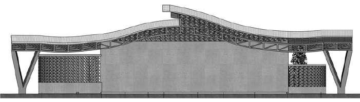 Diantara gulungan ombak terdapat celah kosong yang dapat dilewati angin. Mengadaptasi ujung gulungan ombak yang transparan. Diubah ke bentuk sederhana dan sifat transparan dipertahankan. Repetisi bentuk garis seperti garis alur ombak. Merespon termal dan intensitas cahaya dalam bangunan, maka fasad bagian depan menggunakan material kaca dan frame kayu agar cahaya dapat masuk ke dalam ruangan