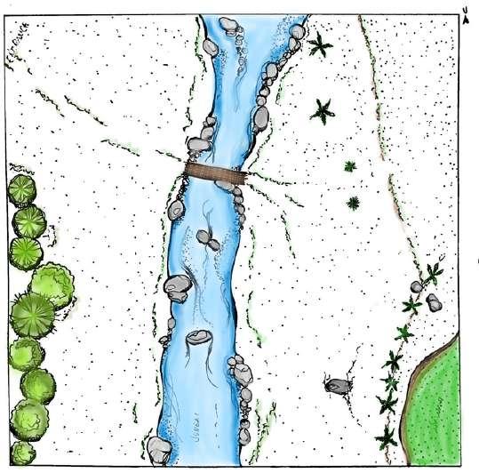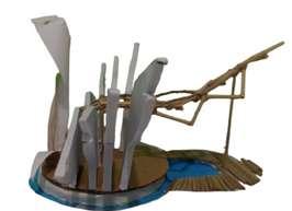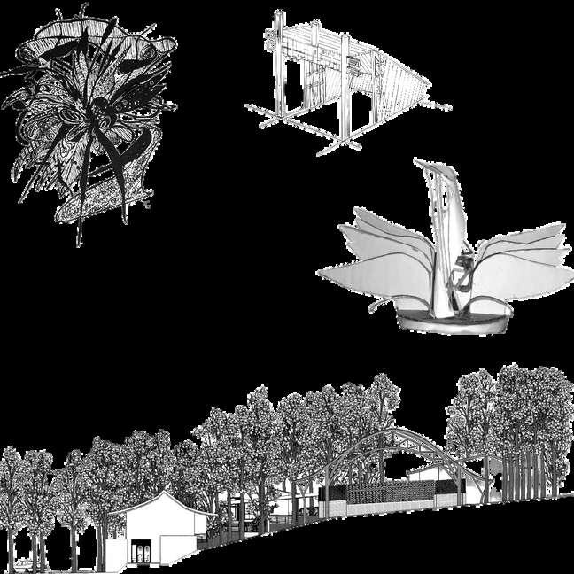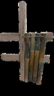 ada pada site dengan mengarahkan ranting yang mengitari dua engan arah aliran sungai mengalir Ukuran desain dibuat lebih tinggi a Mempertahankan bentuk batang pohon dan menambahkan n memodifikasi posisi juga bentuk ranting pohon Ranting pattern abstrak, diameter berbeda-beda dan menambah estetika ranting dibuat fixed joint dengan mengikat sambungannya
