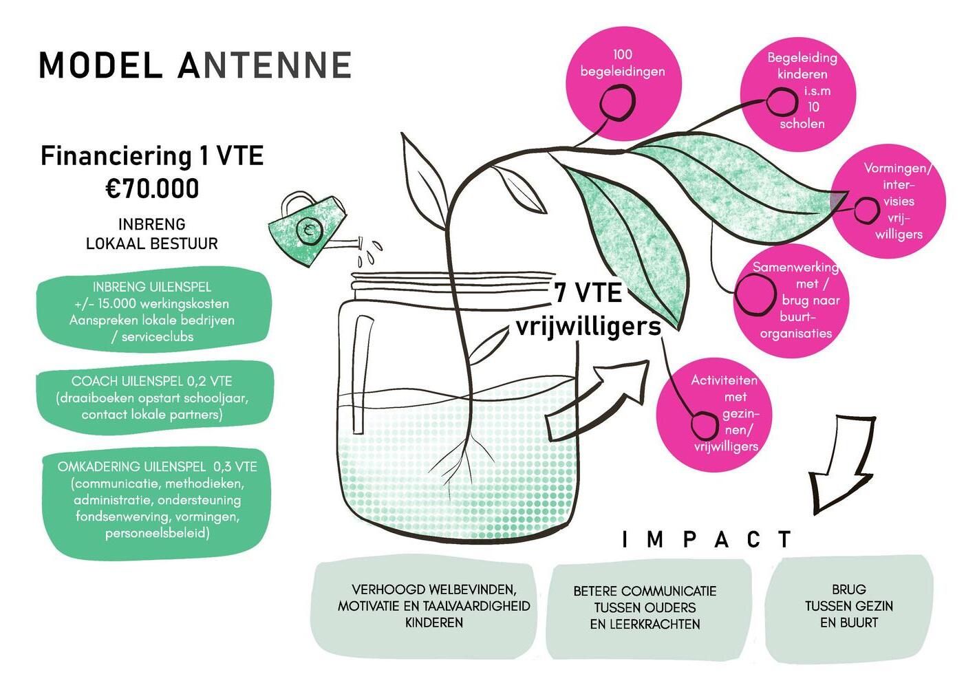 De buurtgerichte aanpak is de belangrijkste kracht van Uilenspel, die de werking bijzonder duurzaam maakt. De schoolse ondersteuning vormt een ‘toegangspoort’ tot het gezin Dankzij de vertrouwensband die er ontstaat tussen vrijwilliger en gezin, is er al snel ruimte om het over bredere en niet-schoolse thema’s te hebben De vrijwilliger en het gezin nemen samen deel aan activiteiten en/of zetten samen de stap naar lokale dienstverlening indien nodig. De buurtintegratie van het gezin neemt hierdoor toe en het netwerk van het gezin en de vrijwilliger verbreedt