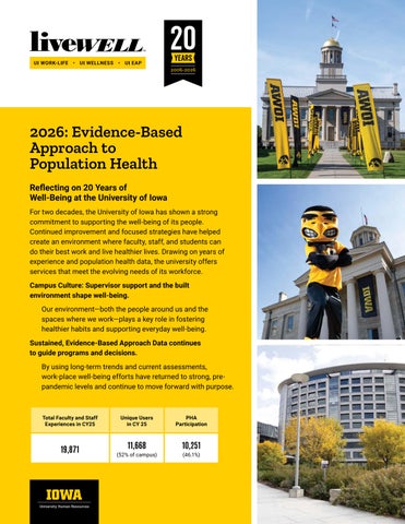 For two decades, the University of Iowa has shown a strong commitment to supporting the well-being of its people. Continued improvement and focused strategies have helped create an environment where faculty, staff, and students can do their best work and live healthier lives. Drawing on years of experience and population health data, the university offers services that meet the evolving needs of its workforce.