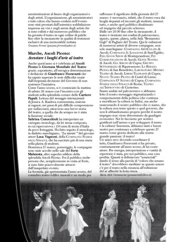 rafforzare il significato della giornata del 27 marzo: è necessario, infatti, che il teatro esca dai luoghi deputati ed incontri gli studenti, innanzi tutto, e anche quel pubblico disabituato ed impigrito dal piccolo schermo. Dalle ore 20.00 fino oltre la mezzanotte, il teatro è rientrato nei confini di palcoscenico, sipario, quinte, platea, nella Sala “Beniamino Gigli” di Pagliare del Tronto. Qui le esibizioni di numerosi artisti di diverse compagnie, non solo marchigiane: Compagnia ArtiColate di Ascoli; Compagnia Il Loggione di Sant’Egidio; Feel Good Show di Monteprandone; Fly Communications di Ascoli; Gente Nostra di Ascoli; Gli Aironi di Cupra; Gruppo Settemmezzo di Ripatransone; La Ribalta Picena di San Benedetto; Laboratorio Minimo Teatro di Ascoli; Liberi Teatranti di Cupra; Nuovo Teatro Piceno di Castel di Lama; Compagnia O’ Scenici di Cupra; Compagnia Stabile degli Stracci di Roma; Teatro all’Improvviso di Camerino. Siamo andati sul palcoscenico e abbiamo letto il nostro messaggio stigmatizzando i comportamenti della politica (che continua a mortificare la cultura in Italia), ma anche rassicurando il nostro pubblico che ci siamo, che la cultura non teme questo o quel governo, che non li abbandoniamo proprio perché il nostro impegno non viene determinato da guadagni economici. Noi lo facciamo per sentirci gratificati nell’animo e per sviluppare il teatro e la cultura! Insomma, abbiamo tanti e buoni motivi per continuare a celebrare questo 27 marzo come giorno dedicato alla nostra grande passione: il teatro! Un unico neo: dovendo coordinare il tutto, Gianfranco Fioravanti ci ha privato, contrariamente all’anno scorso, di lui come attore. Per energia, interpretazione e vastità di repertorio è stata, per noi pubblico, una vera perdita. Quanti si definiscono “amatoriali” dando il senso alla parola di “coloro che amano il teatro” dovrebbero meditare su quanto amore c’è per il teatro nella rinuncia all’esibizione del sé affinché la festa riesca. Maria Adele Giommarini (giommarini@libero.it)