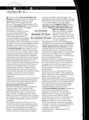 l 27 marzo 2012 la Giornata Mondiale del Teatro ha compiuto 50 anni. Un anniversario importante per questa celebrazione voluta dall’U.N.E.S.C.O. che la istituì nel 1961, attraverso l’International Theatre Institute (I.T.I.). Quest’anno, John Malkovich, attore statunitense, ha avuto l’onore di scrivere il messaggio internazionale, che ha letto personalmente a Parigi il 22 marzo in occasione della celebrazione ufficiale dell’U.N.E.S.C.O.: “Possa il vostro lavoro aiutarci a pensare, aiutarci a domandare che cosa significhi essere umani, e che questo pensiero possa essere sostenuto col cuore, con la sincerità, con il candore e con la grazia”. È questo uno dei passaggi centrali del messaggio, rivolto a tutti coloro che per lavoro o solo per passione, calcano le assi del palcoscenico. La Giornata Mondiale esiste, quindi, non solo per ricordarci che esiste il teatro, ma anche come occasione speciale per sottolineare quanto il teatro è importante nella cultura e nella vita dei popoli, in modo trasversale e transnazionale. Migliaia le manifestazioni nel mondo dove il teatro svolge un ruolo di primo piano nella cultura e nella società. L’Italia, culla della Commedia dell’Arte e del teatro nei secoli, ha lasciato passare per l’ennesima volta questa ricorrenza. Solo nel 2010 il Governo Italiano e il teatro professionistico, per motivi di opportunismo culturale e mediatico, hanno partecipato alla festa. Come spesso capita, è nel mondo teatrale amatoriale che troviamo la vivacità, la passione e la fantasia che hanno permesso a molti di condividere questo evento unico e particolare. È da diversi anni, infatti, che la U.I.L.T. ha fatto del 27 marzo un momento importante della propria vita associativa. Da qui la scommessa, rinnovata di anno in anno, di celebrare degnamente la Giornata Mondiale del Teatro. Quest’anno sono state oltre 70 le manifestazioni organizzate dalle U.I.L.T. regionali e dalle compagnie affiliate che, dal 20 marzo ai primi giorni di aprile, hanno dato vita ad eventi che hanno coinvolto la maggior parte delle regioni italiane, sotto forma di festival, concorsi, convegni, incontri nelle scuole o semplicemente nella lettura del messaggio internazionale in occasione di eventi o spettacoli. Può sembrare una goccia nel mare, ma è una volontà che assume un grande significato perché, pur con scarsi mezzi e risorse, il teatro amatoriale ha ancora una volta dimostrato la vitalità, la passione e la professionalità di una federazione e dei suoi associati. Lo testimoniano le migliaia