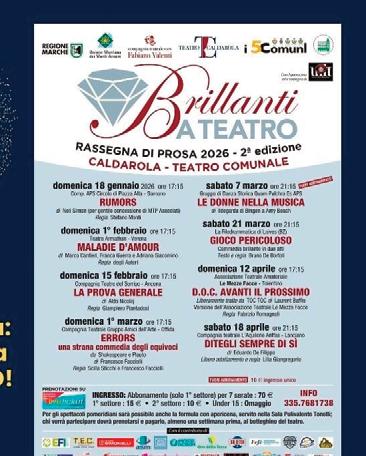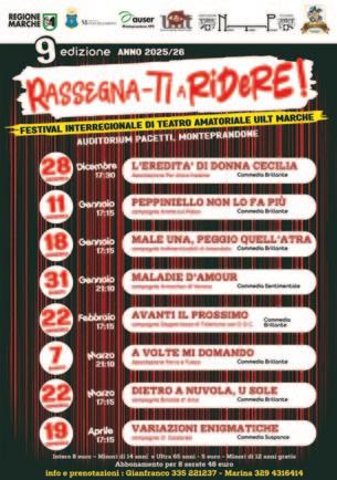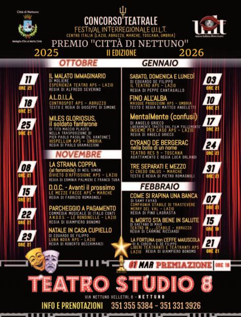 Ha inaugurato la rassegna 2025 lo spettacolo ChepasticcioMrs.Peach, scritto e diretto da Alessandro Iacovelli e portato in scena dalla COMPAGNIA DELLA LIRA (Puglia). A seguire il testo teatrale di Giancarlo Loffarelli Diecigiugnoventiquattro, prodotto dall’Associazione Culturale LE COLONNE (Lazio). A marzo scorso Così è se vi pare di Luigi Pirandello, spettacolo presentato dalla Compagnia Teatrale AVALON (Campania) con la regia di Gerry Petrosino. Poi uno spettacolo emozionante e capace di far riflettere: inVIOLAta, di David Marzi e Teresa Cecere presentato dalla Compagnia SENZA CONFINE (Puglia). A seguire lo spettacolo Penelope, l’eredità delle donne scritto da Marco Balma con la regia e riadattamento di Vanessa Leonini, realizzato dalla COMPAGNIA DEGLI EVASI (Liguria). Ha concluso la scorsa rassegna la Compagnia IL TEATRO DELL’INUTILE (Toscana) che si è esibita nella commedia Smith & Wesson di Alessandro Baricco, con la regia di Daniele Torrini.