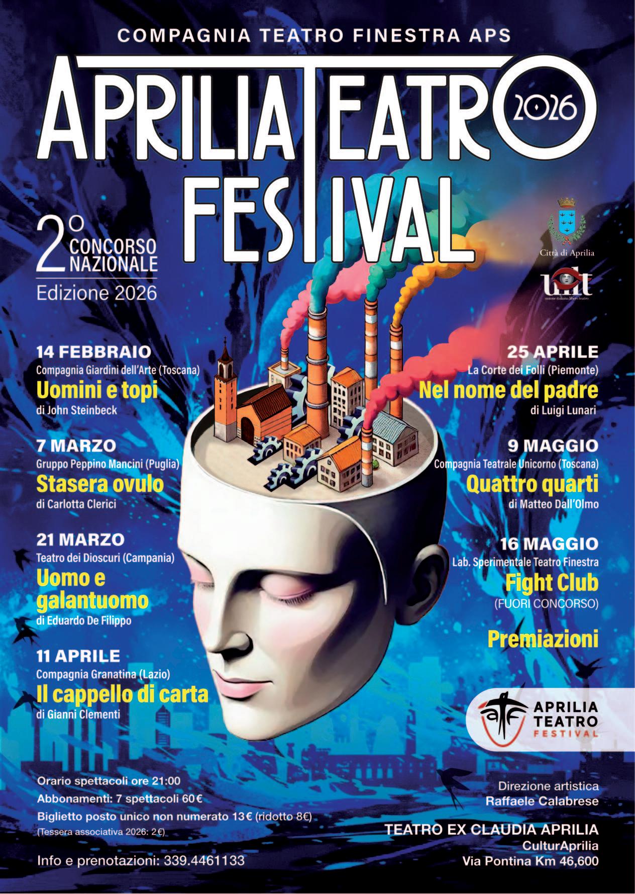 Ed ora... un’occhiata al futuro semplice, oltre al nostro citato ”Jucatúre” attualmente in scena, si è concretizzato il cartellone della 2a Edizione della rassegna APRILIA TEATRO FESTIVAL, nel bellissimo teatro “Alla Claudia”. Anche quest’anno sono state numerosissime le proposte esaminate, sintomo di un interesse ed una vivacità del panorama nazionale. Di seguito le sei finaliste.