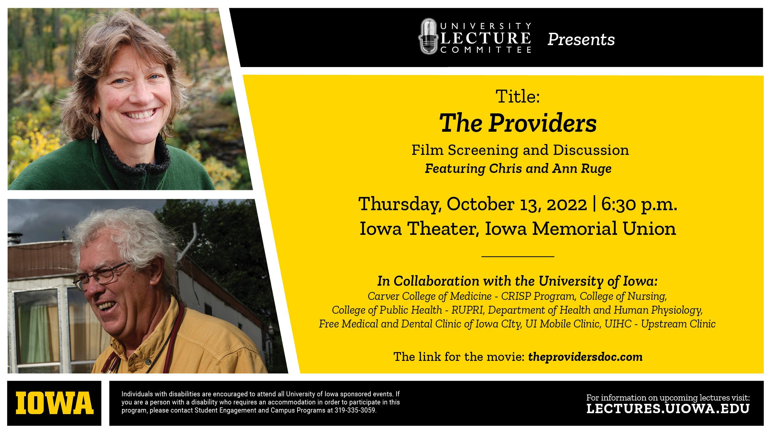 The Department of Health and Human Physiology co sponsored a UI Lecture on October 13, 2022. The UI Lecture showed a viewing of a documentary called The Providers with a question and-answer segment following featuring one of the providers featured in the film, Chris Ruge, and his wife Ann Ruge. Chris is a nurse practitioner and Ann is a certified nurse midwife. The film follows three healthcare providers that bring care to those living on the margins, in a rural American community struggling with a shortage of doctors and the ravages of the opioid epidemic. The event was organized by Professor Gayle Walter.