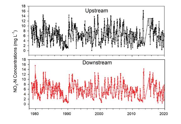 Nitrate-nitrogen (NO3-N) concentrations measured upstream and downstream of Lake Red Rock. Upstream concentrations averaged 6.35 mg/L upstream of the reservoir and 5.74 mg/L downstream.