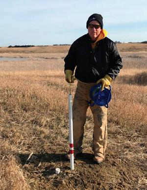 State Geologist Keith Schilling measuring water table depths at a newly installed monitoring well at the Spring Run Wetland Complex near East Okoboji Lake, in Dickinson County.