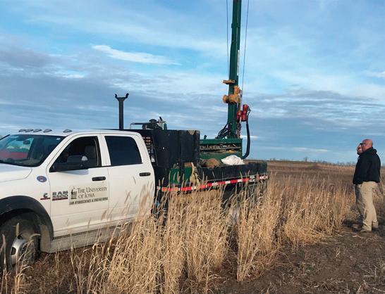 THE IOWA GEOLOGICAL SURVEY (IGS) has a long history of collaboration with the Department of Earth and Environmental Sciences (EES), formerly the Department of Geology, at the University of Iowa. A key component of this relationship is the training and employment of students, both undergraduates and graduates. Students are hired under various IGS grants and contracts (e.g., the United States Geological Survey’s STATEMAP, Earth MRI, and National Geological and Geophysical Data Preservation programs). A recent threeyear National Science Foundation (NSF) Improving Undergraduate STEM Education (IUSE) grant (Iowa Environmental Internship Pathways Program) received by EES faculty and IGS staff also provides funding for five undergraduate student summer internships. These opportunities allow the IGS to integrate students into our ongoing initiatives, to the benefit of all involved (Figures 1 and 2). Students have the chance to apply their prior knowledge and their own life experiences to real-world geoscience projects while also gaining valuable skills that will allow them to enhance their understanding of the world around them. Most recently, IGS interns have assisted with describing and logging cutting samples, bedrock and unconsolidated core sampling for a variety of laboratory analyses, collecting horizontal-to-vertical spectral ratio (HVSR) passive seismic geophysics data, field reconnaissance to investigate bedrock and Quaternary exposures, and working with an assortment of GIS data sets. Furthermore, IGS staff also actively participate in the EES curriculum. Some staff help teach courses and/or provide hands-on, in-class demonstrations about core description and geophysical data collection. IGS staff also help with educational field excursions around Iowa that encompass a variety of practical science issues such as soil health, surface and subsurface hydrogeology, and geologic mapping.