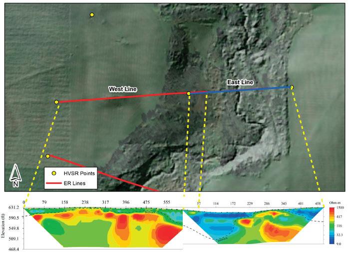 Map view (top) showing two of the electrical resistivity (ER) geophysical lines completed as a part of this site characterization. The ER geophysical results (bottom, left-to-right) from the West Line and the East Line, respectively. Locations of horizontal-to-vertical spectral ratio (HVSR) passive seismic data are also shown.