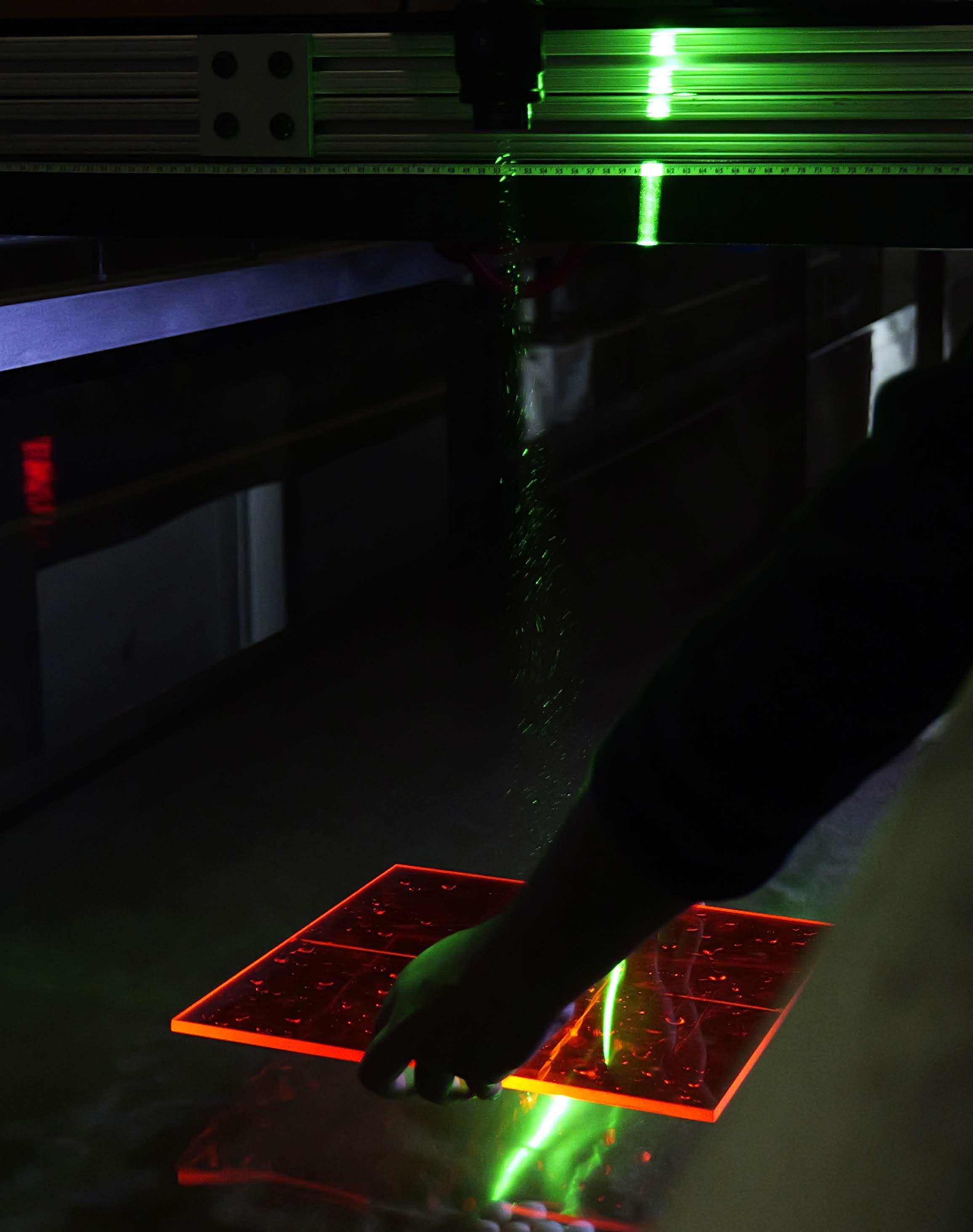 The laser beam from the particle image velocimeter (PIV) reflects off the acrylic calibration plate. The laser helps illuminate the particles in water to capture and study the flow field.