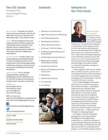 some of our 2016– 17 activities in this new magazine from the Iowa Geological Survey (IGS). Our publication represents a continuation of the transition of the IGS from our previous administrative home in the Iowa Department of Natural Resources to our current home within IIHR—Hydroscience & Engineering (IIHR) at the University of Iowa (UI). Since the move in 2014, the IGS has continued to serve Iowans by providing the geologic and hydrologic information needed to understand and better manage our natural resources. In this magazine, which we are calling The igs Geode, we report on some of our interesting activities and list examples of our public engagement and summarize presentations and publications made by IGS staff in the last 12 months. The igs Geode highlights the breadth and scope of our research, education, and outreach activities. IGS geologists Stephanie Surine, Phil Kerr, Ryan Clark, and Huaibao (Paul) Liu showcase their efforts to map Iowa’s surficial and bedrock resources through the USGS-funded STATEMAP program. You never know what you may find when investigating the subsurface, and Liu reports on the discovery of a worldclass fossil locality in a previouslyunknown meteorite impact structure in the Decorah area — a discovery found through our mapping program. Our ability to map the subsurface geology and conduct groundwater investigations was significantly enhanced in 2017 with the purchase of a new Giddings drilling rig. Soil Scientist Matthew Streeter certainly kept the new rig busy last fall! Our exciting GeoCore program, co-led by Rick Langel and Jason