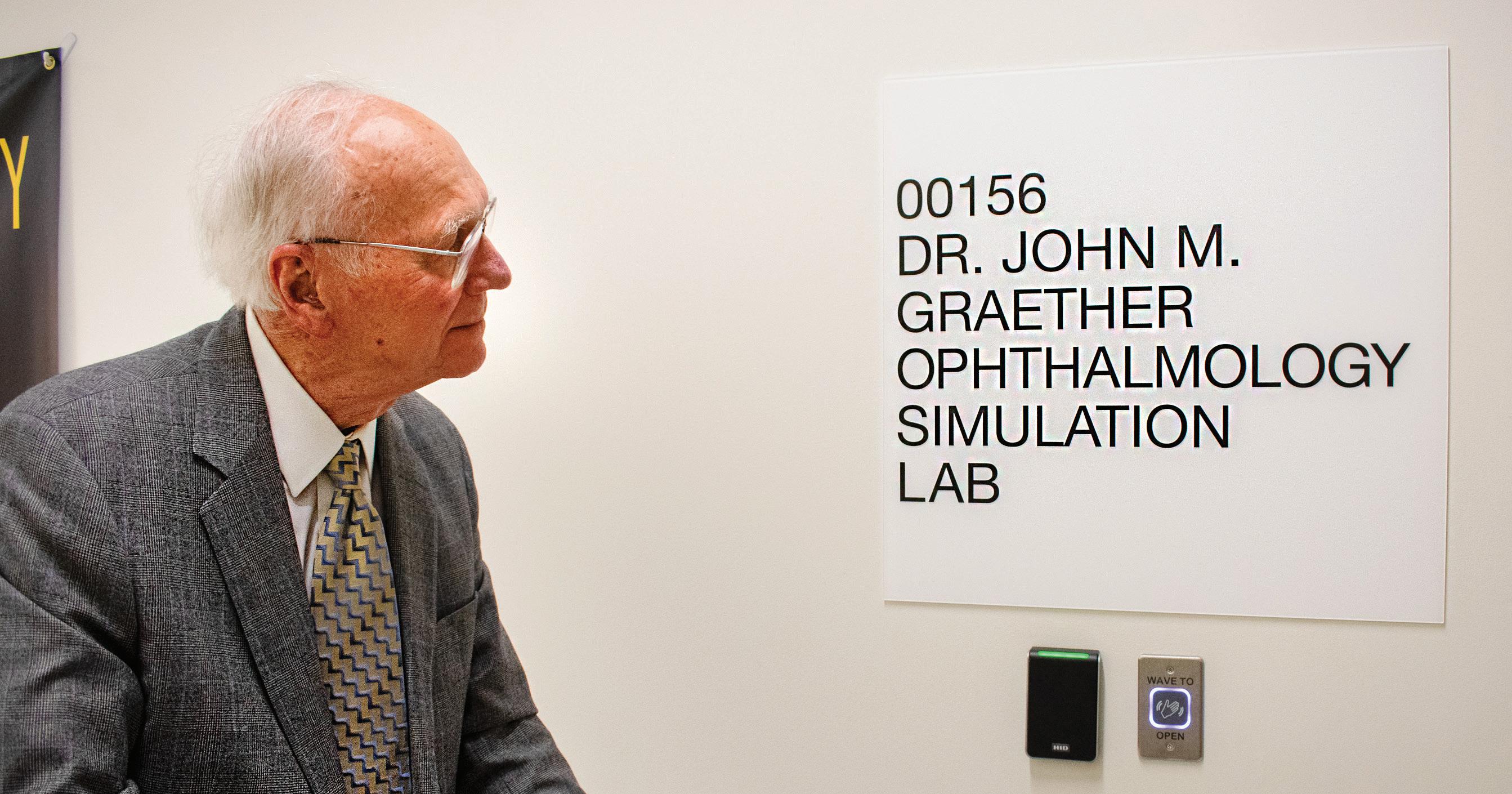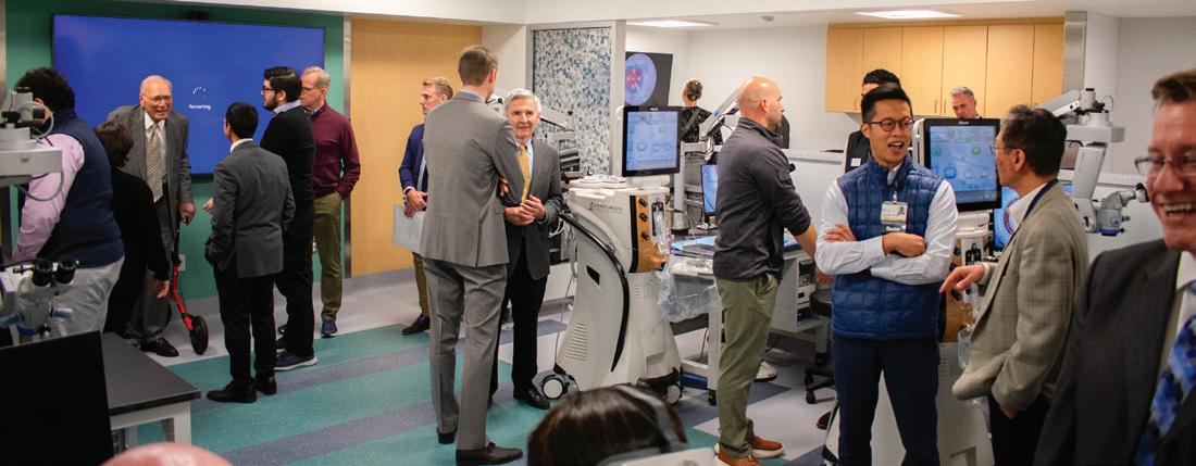 On October 13th we officially opened the new Dr. John M. Graether Ophthalmology Simulation Laboratory. This new simulation lab is an ophthalmology-dedicated space and includes seven stations—one teaching station and six learning stations. Each station includes a tabletopmounted operating microscope with a foot pedal to control the scope. Each station also has a monitor that shows what is seen through the microscope and each monitor can be projected to the large screen at the front of the room. In addition to these stations there is also an Eyesi surgical simulator with retina and phaco capabilities, as well as an Eyesi slit lamp simulator.