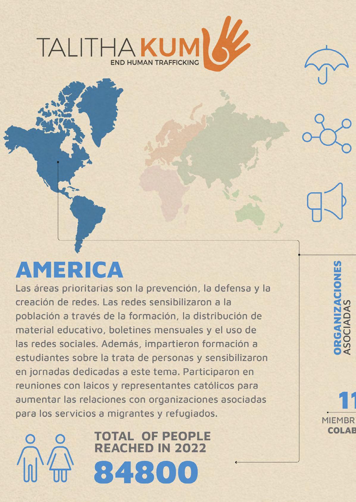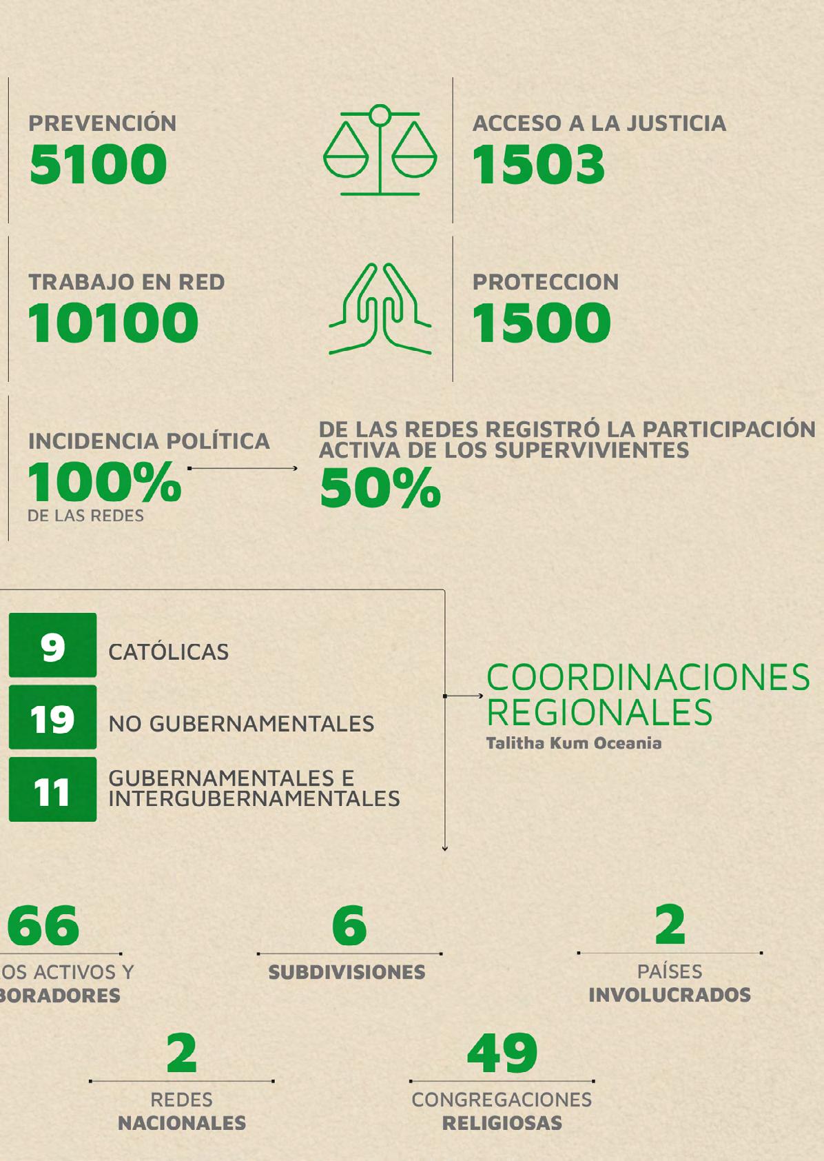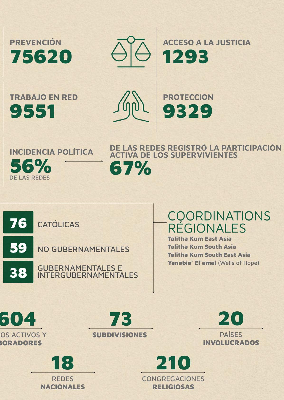 El año 2022 supuso un importante crecimiento cuantitativo y cualitativo para Talitha Kum. Talitha Kum ha crecido hasta convertirse en una red que llega a 560.606 personas en todo el mundo. Esto implicó un aumento del 40 % con respecto al 2021, logrado gracias a nuestras hermanas y hermanos que trabajan incansablemente para desarrollar las principales áreas de acción de Talitha Kum: prevención, cuidado de las víctimas, incidencia y trabajo en red.