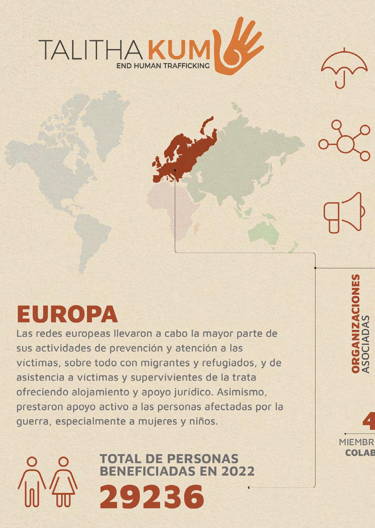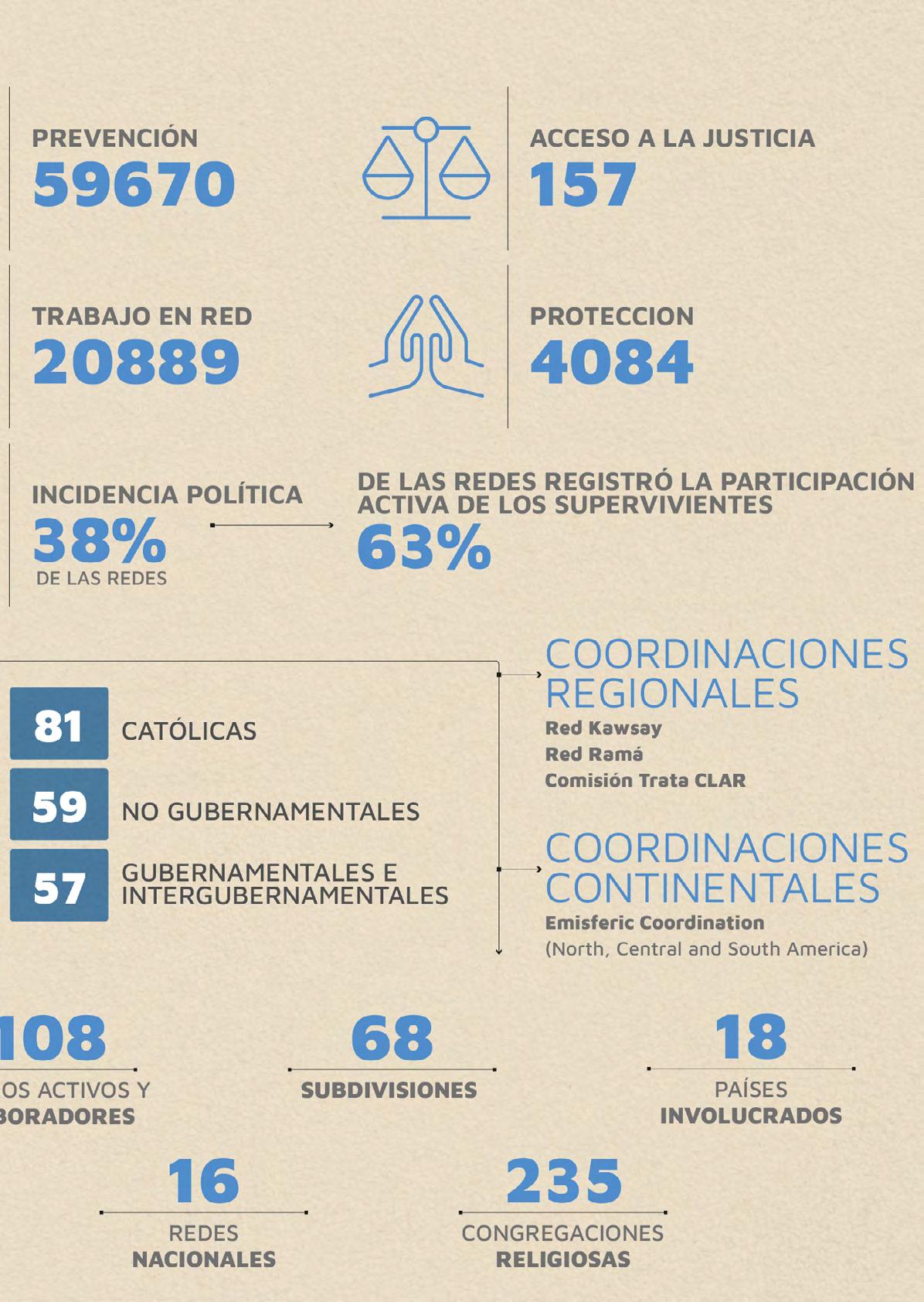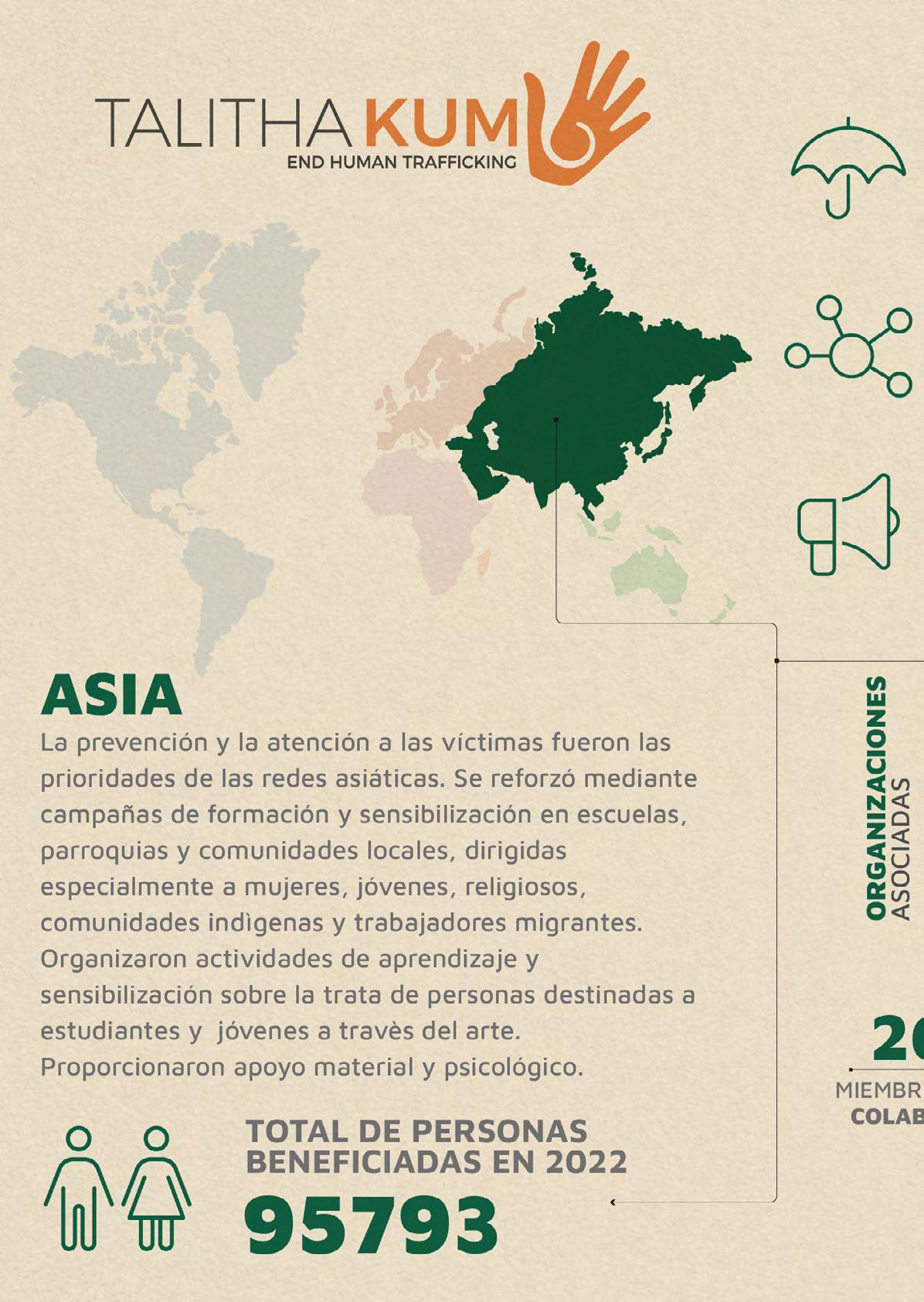 El año 2022 supuso un importante crecimiento cuantitativo y cualitativo para Talitha Kum. Talitha Kum ha crecido hasta convertirse en una red que llega a 560.606 personas en todo el mundo. Esto implicó un aumento del 40 % con respecto al 2021, logrado gracias a nuestras hermanas y hermanos que trabajan incansablemente para desarrollar las principales áreas de acción de Talitha Kum: prevención, cuidado de las víctimas, incidencia y trabajo en red.