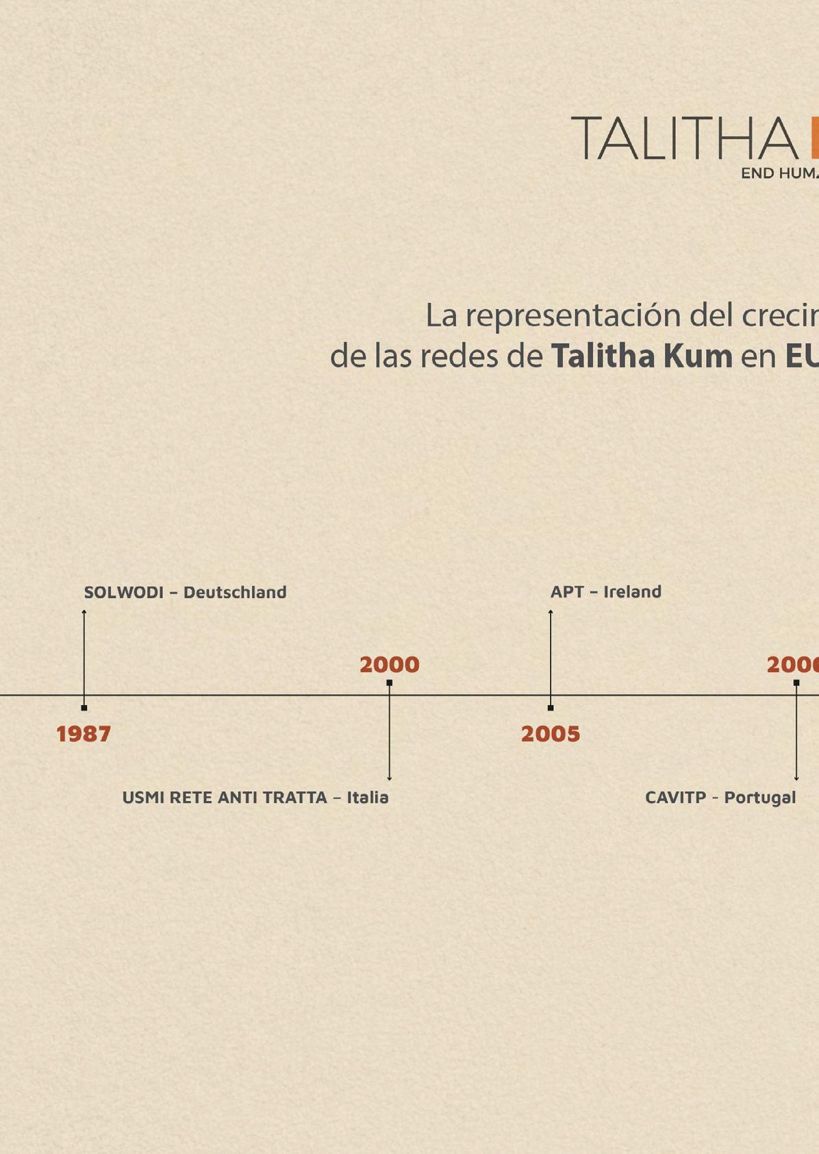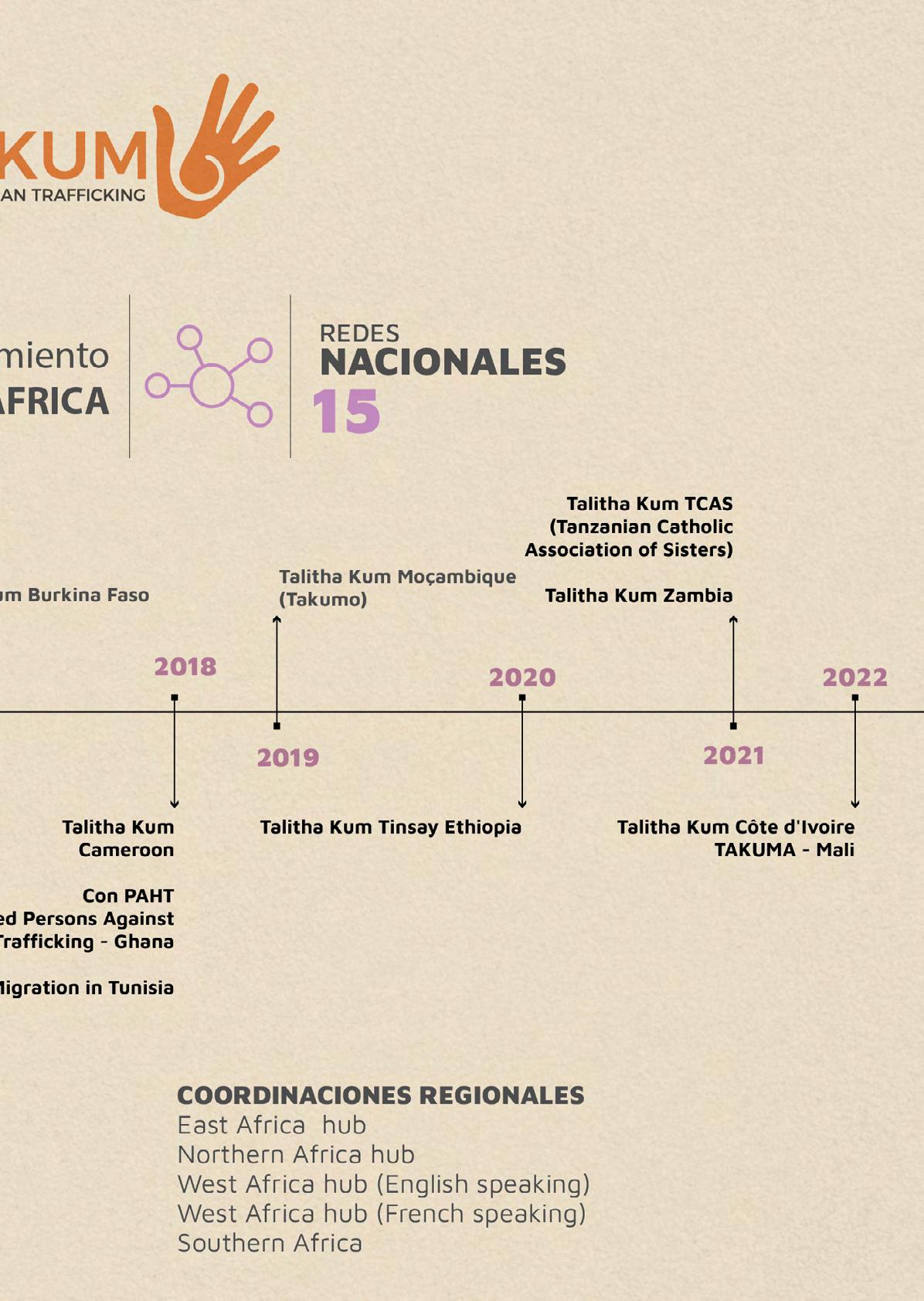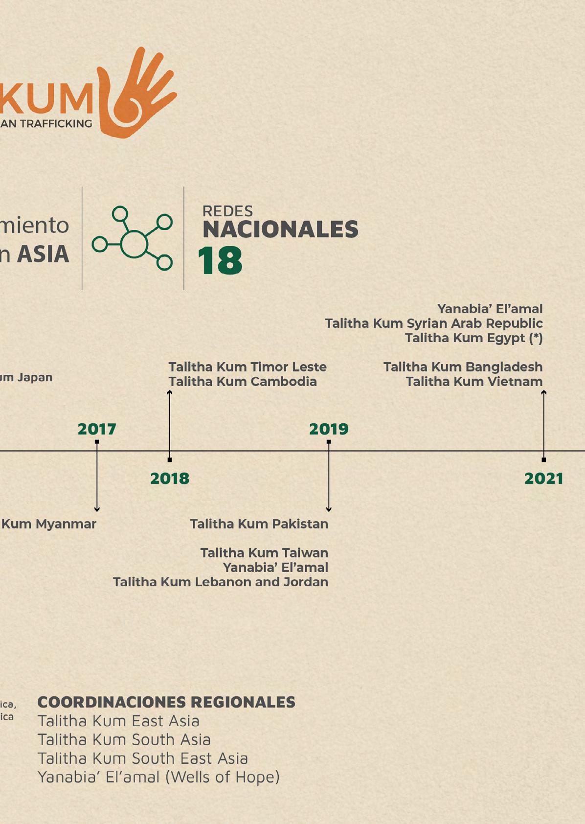 Establecida formalmente en 2009 en la Unione Internazionale delle Superiore Generali (UISG) como iniciativa internacional contra la trata y la explotación de personas, Talitha Kum promueve la colaboración entre redes organizadas a escala nacional, regional y continental, apoyando activamente a víctimas, sobrevivientes y personas en situación de riesgo.