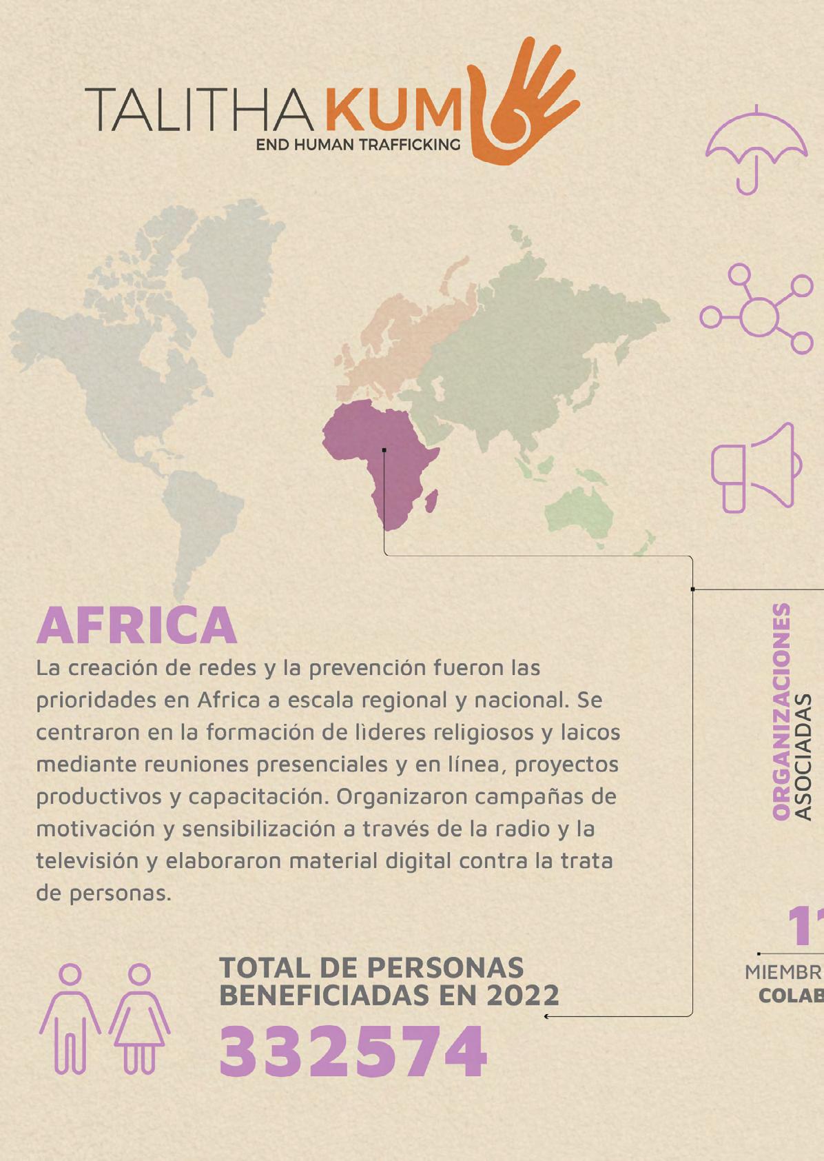 Por último, la primera conferencia regional de Talitha Kum África se celebró en Nairobi, Kenia, del 20 al 26 de noviembre de 2022, con el tema “Red africana libre de esclavitud”. A la conferencia asistieron 35 participantes (religiosos y religiosas), en representación de 15 países de las regiones anglófona y francófona. La reunión fue una estimulante oportunidad para escuchar en profundidad y compartir experiencias, que enriquecen y orientan la misión de Talitha Kum para acabar con la trata de personas. Este foro institucionalizó la creación de núcleos geográficos y áreas de interés.